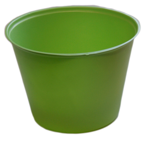 Contenant plastifié vert pomme, diamètre du fond 120mm, diamètre surface 180mm, hauteur 130mm.