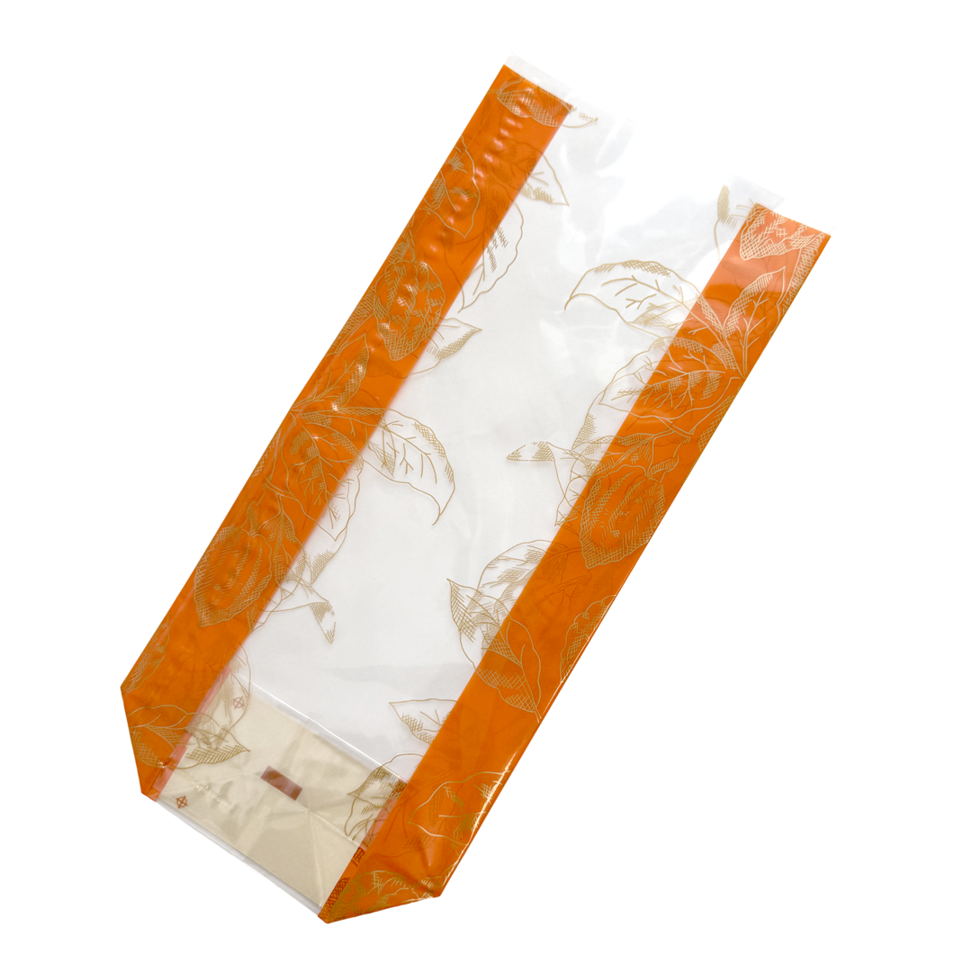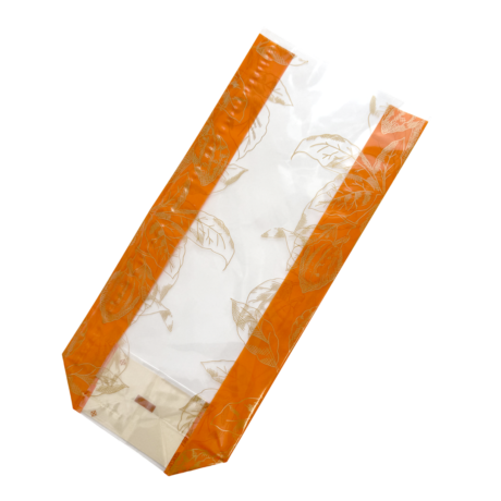 Sachet cellophane avec fond carton , avec imprimé cabosses sur les bandes latérales, devant et dos clairs