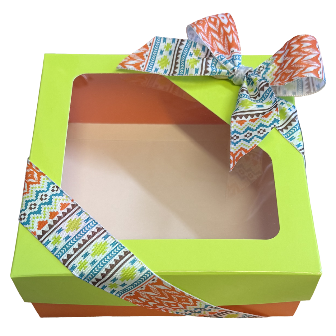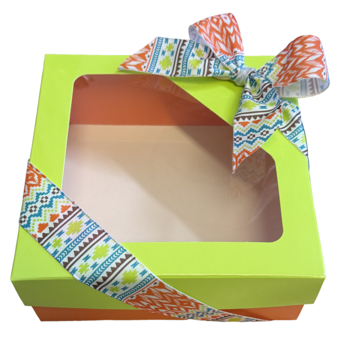 Boite pliante carrée boho, à assembler avec fenêtre, couleur vert limette fini glacé. Base orange mat profonde pour biscuits.