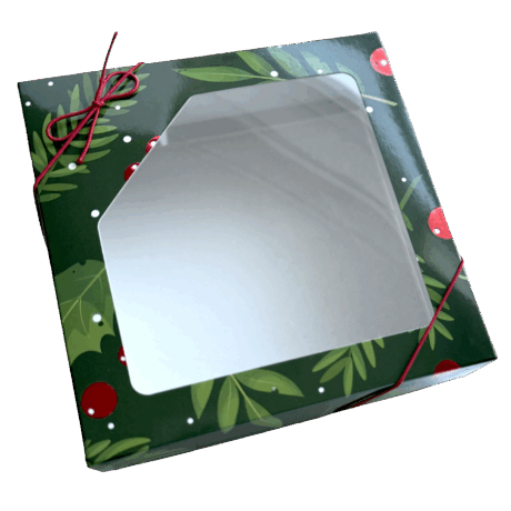 Boite pliante à assembler, carrée Holly, avec fenêtre, motif feuille de gui, tons de vert et baies rouge métallisées. Base blanche profonde pour biscuits.
