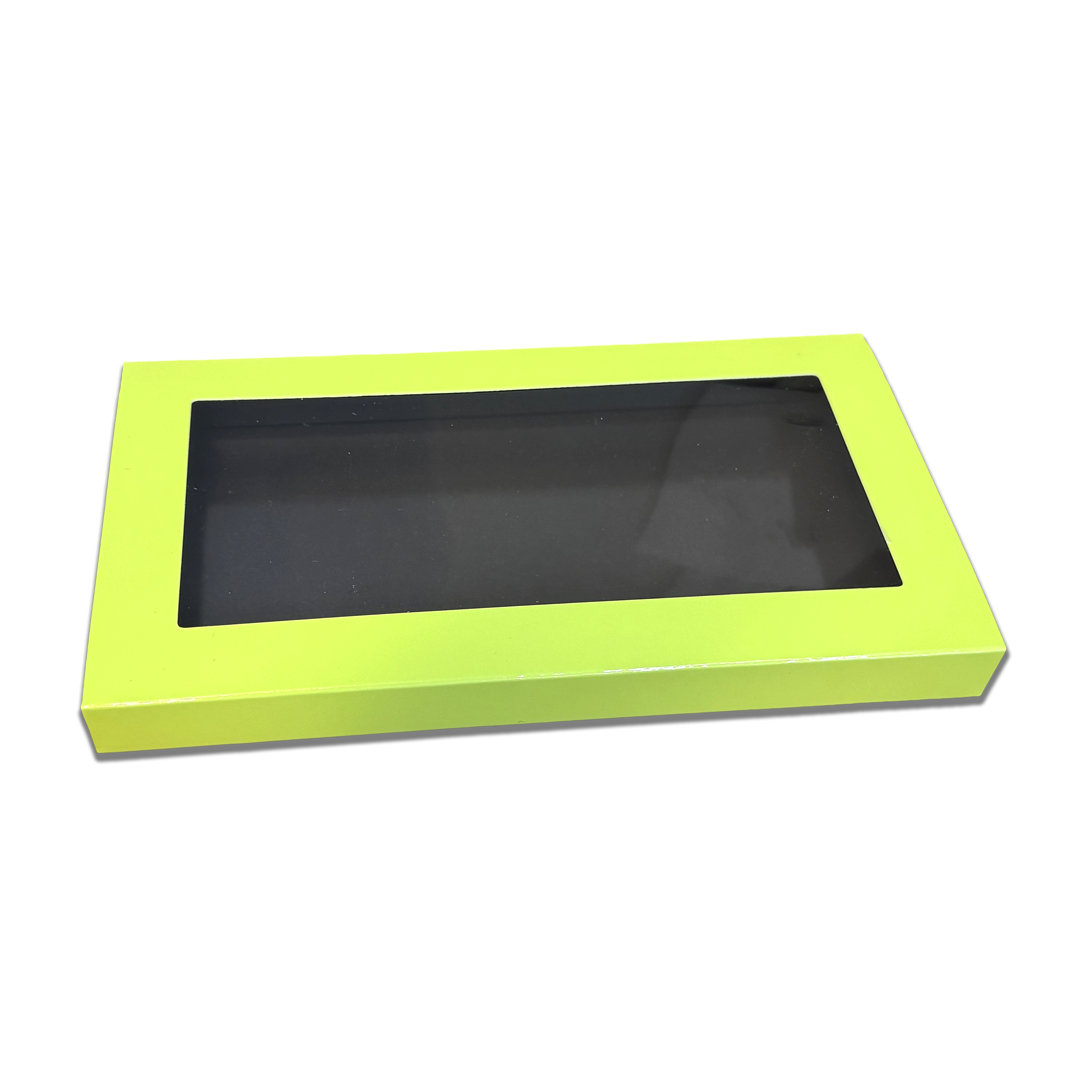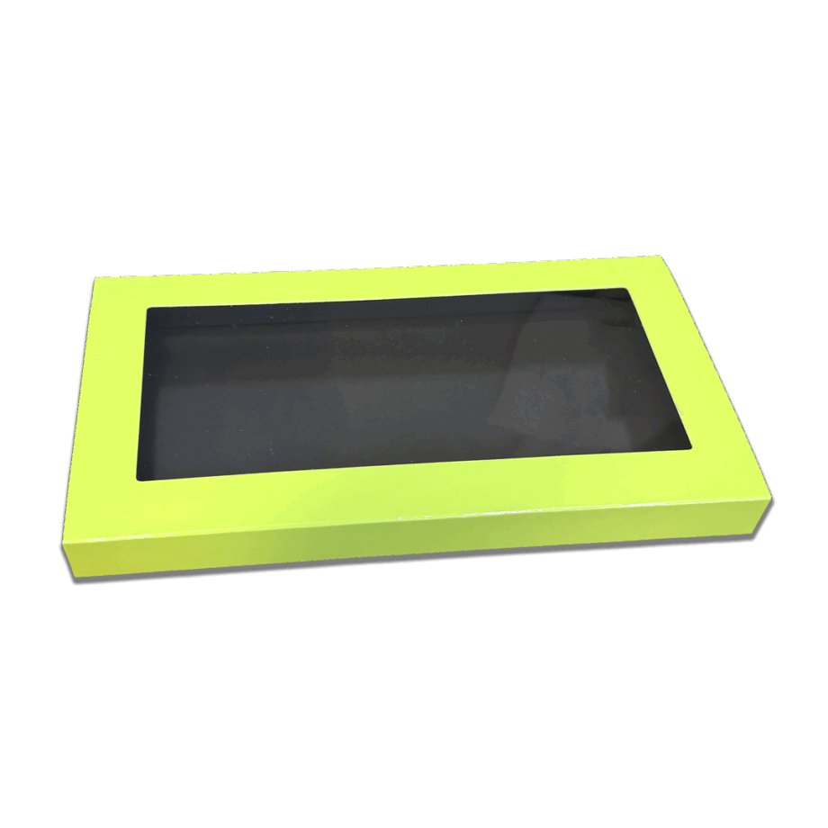 Boite étui, base double paroi peu profonde avec couvert avec fenêtre – Vert Lime et base marron foncé au fini mat (250g).