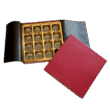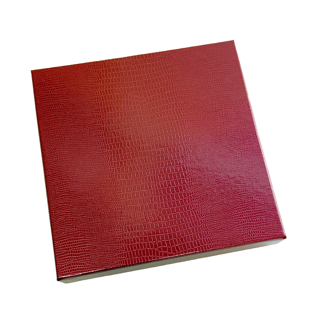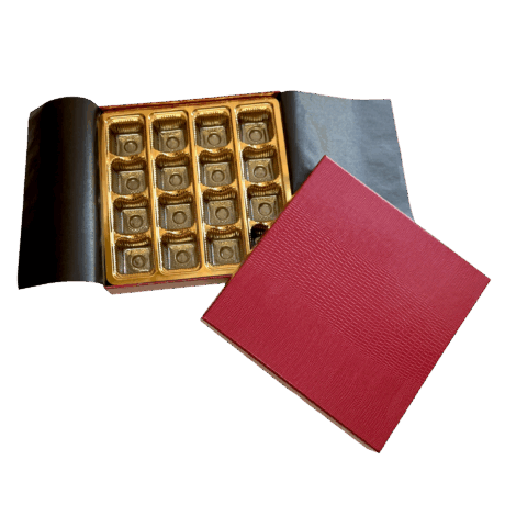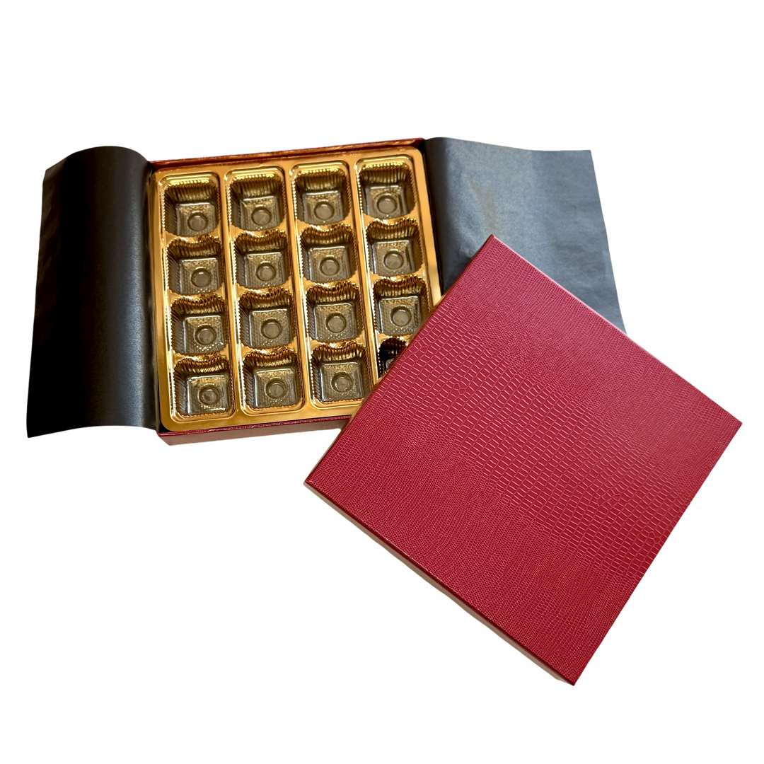 Boîte rigide, collection Croco Illusion Framboise, avec cavités or pour 16 chocolats.