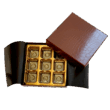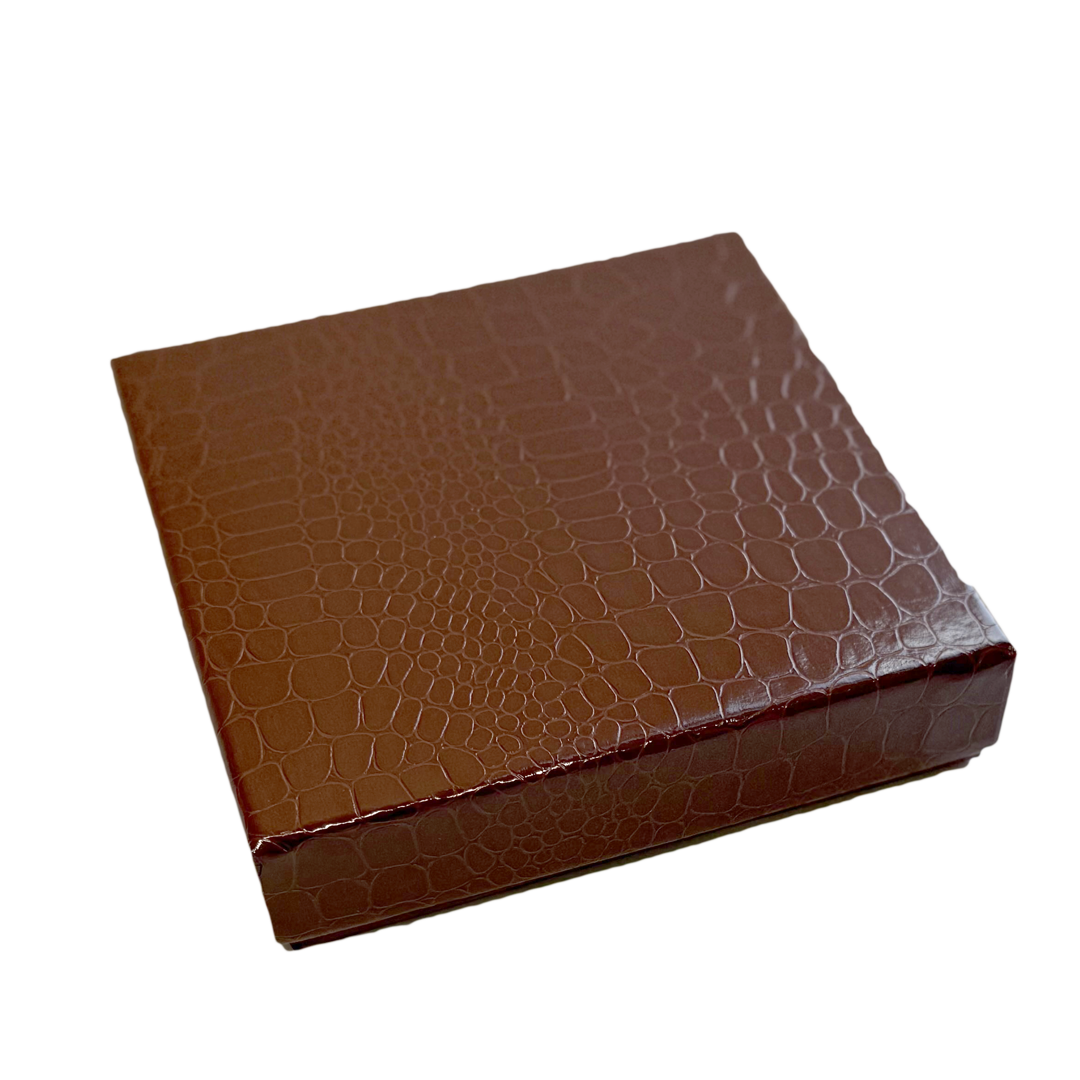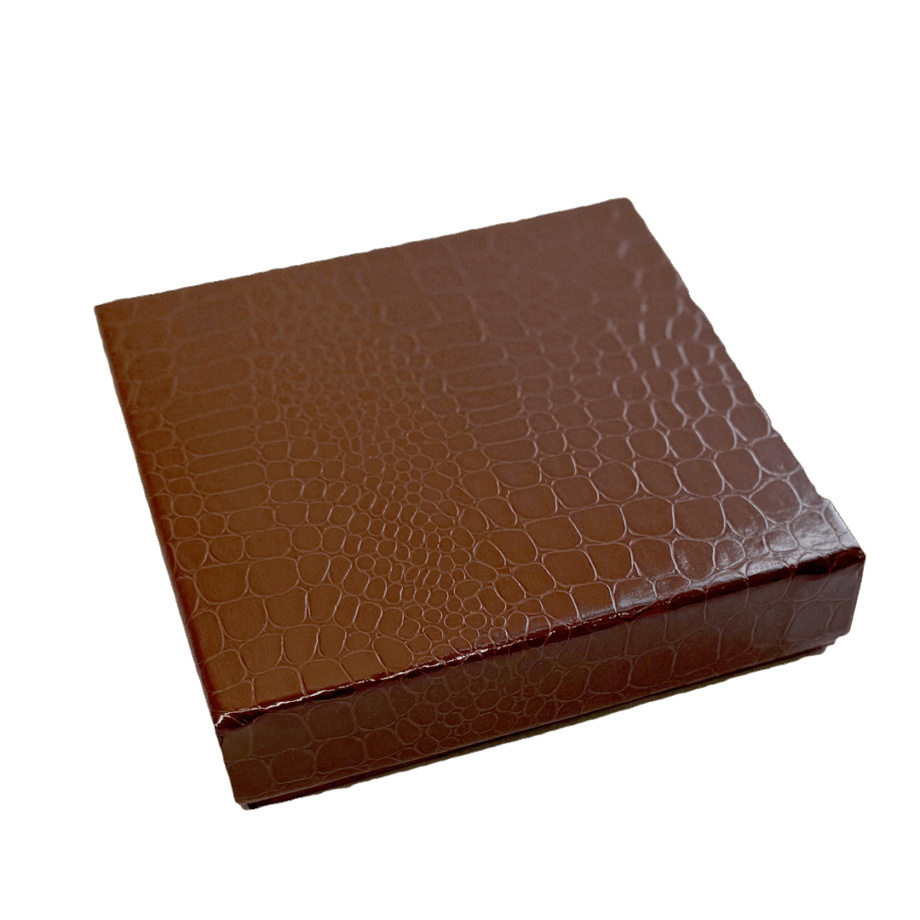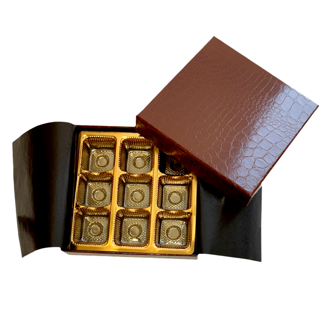 Boîte rigide, collection Croco Illusion Marron, avec cavités or pour 9 chocolats. Feuille glassine incluse.