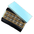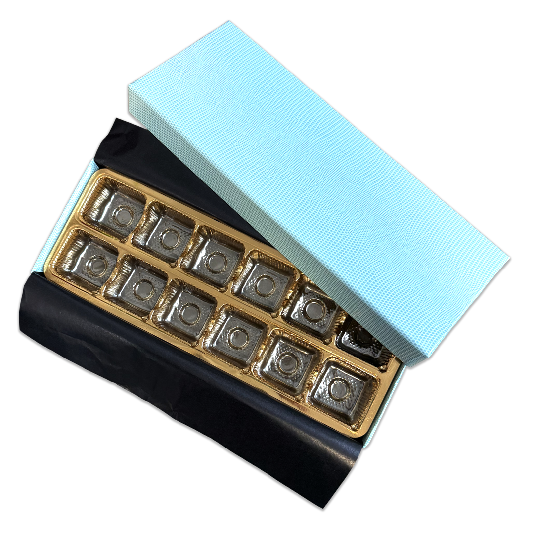 Boîte rigide, collection Cuir – Bleu Paraibo, avec cavité doré. Peut contenir 12 chocolats. Inclus papier glassine. Une exclusivité de Chocolat-Chocolat