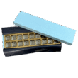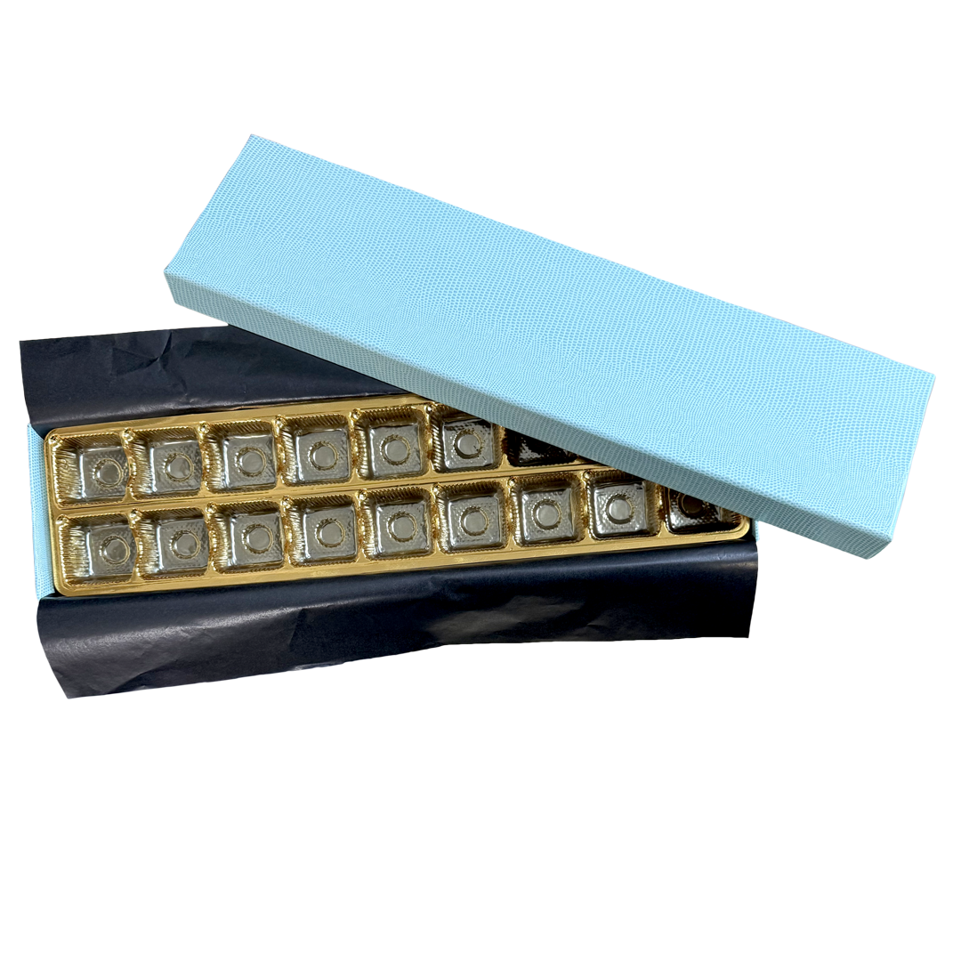 Boîte rigide, collection Cuir – Bleu Paraibo, avec cavité doré. Peut contenir 18 chocolats. Inclus papier glassine.