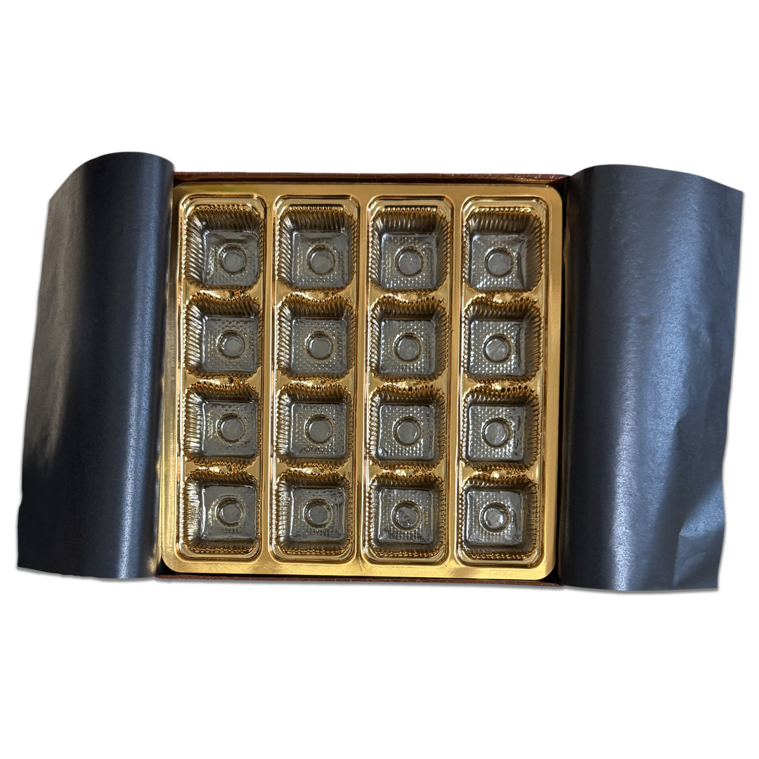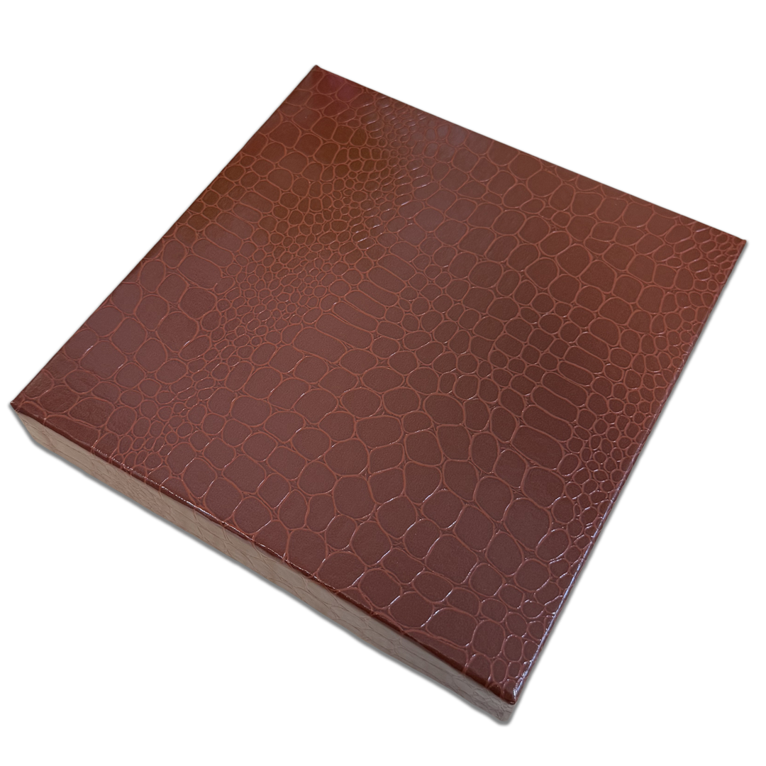 Boîte rigide, collection cuir, Crocodile Marron, avec cavité doré. Peut contenir 16 chocolats. Inclus papier glassine.