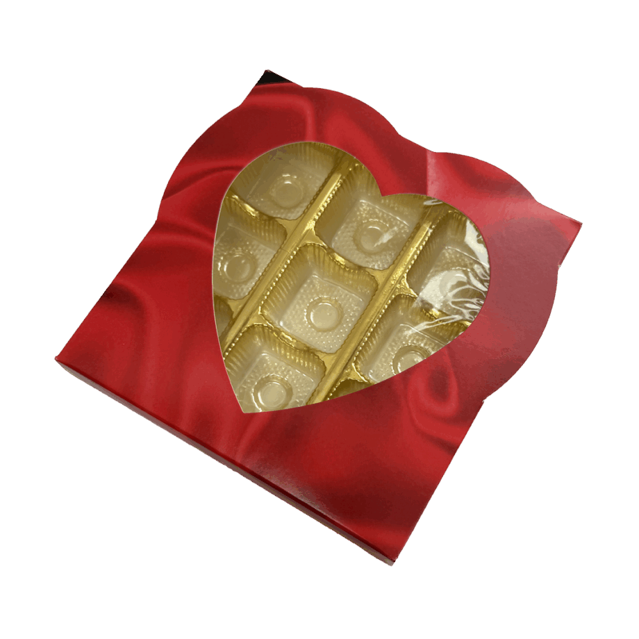 Boîtes pliante pour chocolat avec fenêtre, cavité or pour 9 chocolats inclus.
