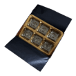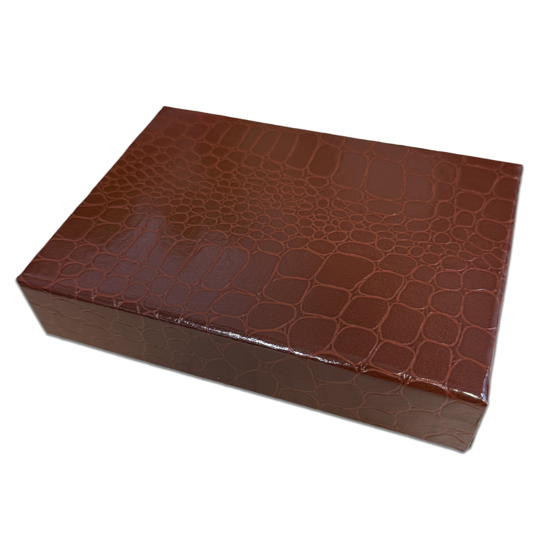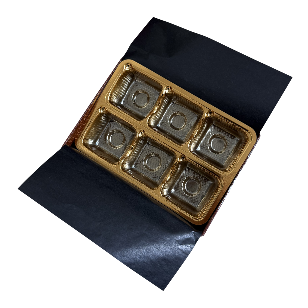 Boîte rigide, collection Croco Illusion – Marron, avec cavité doré. Peut contenir 6 chocolats. Inclus papier glassine.