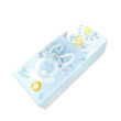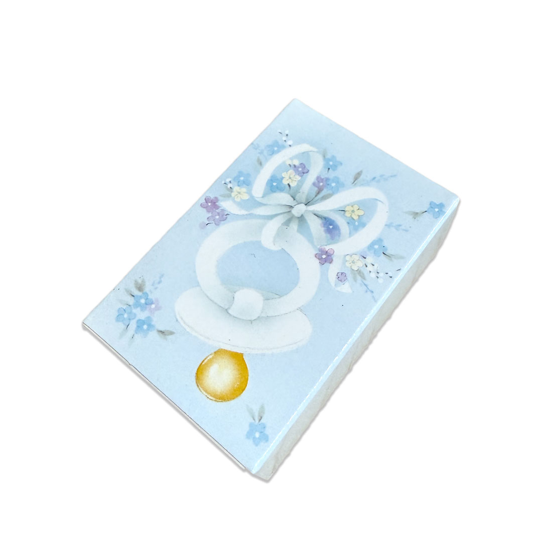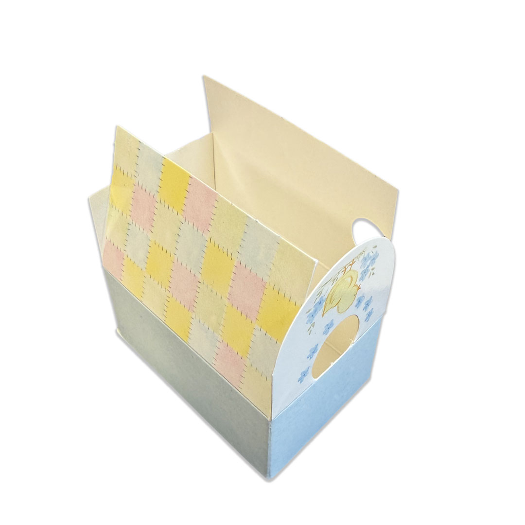 Boite pliante étui « shower de bébé » rétro, les rabats de la boites intérieur représente à la suite, une bavette, une couverture et un pyjama,