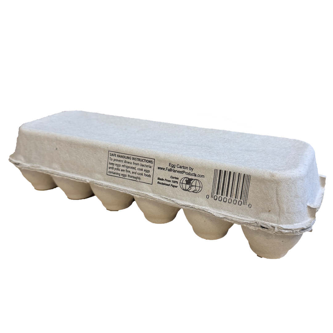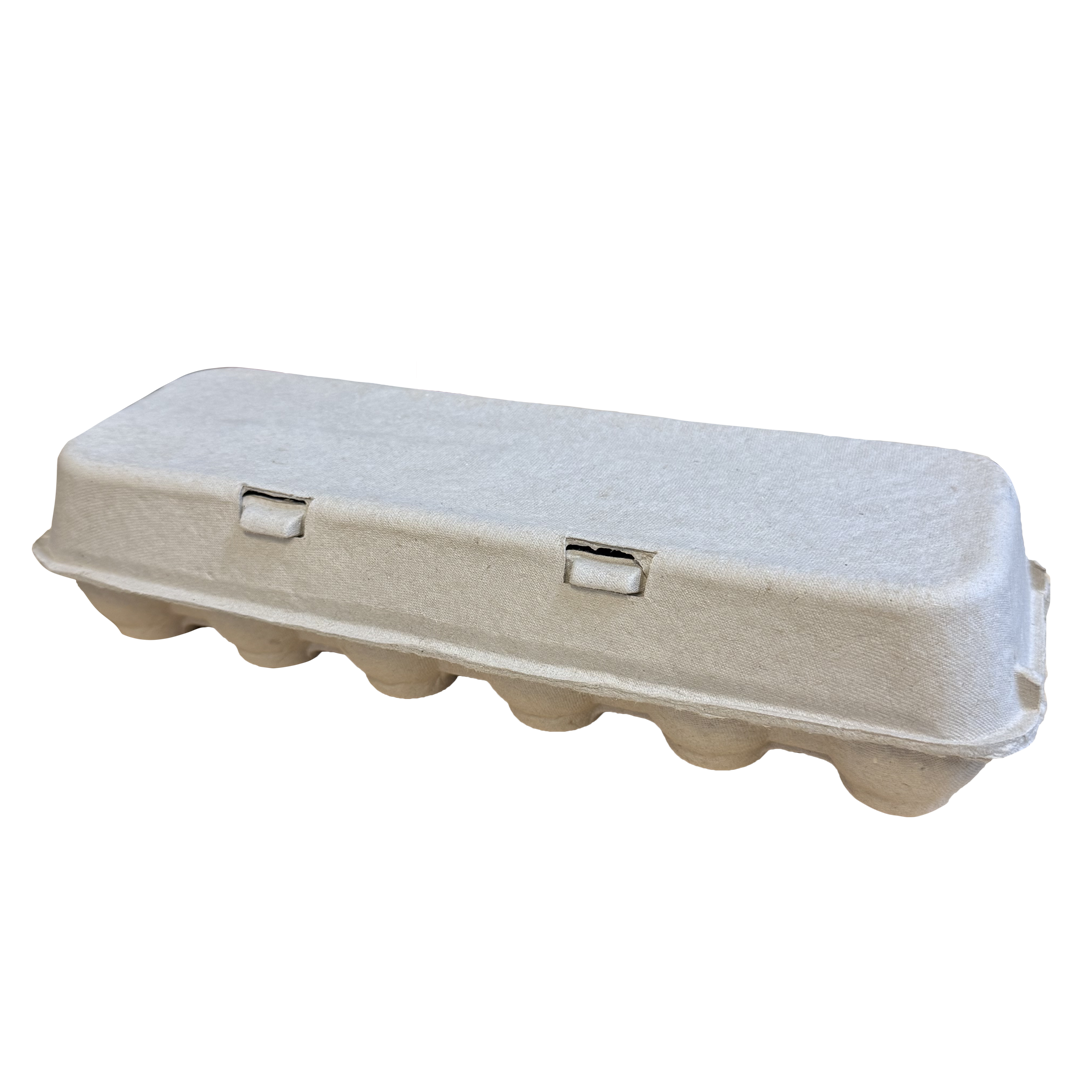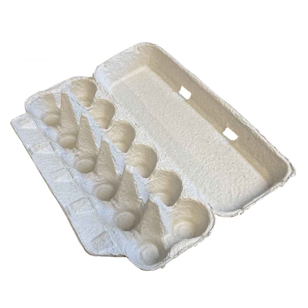 Fabriqué à partir de pâte recyclée, 100% recyclable. Carton pulpe naturel pliable de 12 œufs (2X6), inscription à l’arrière (voir photo ci-joint)