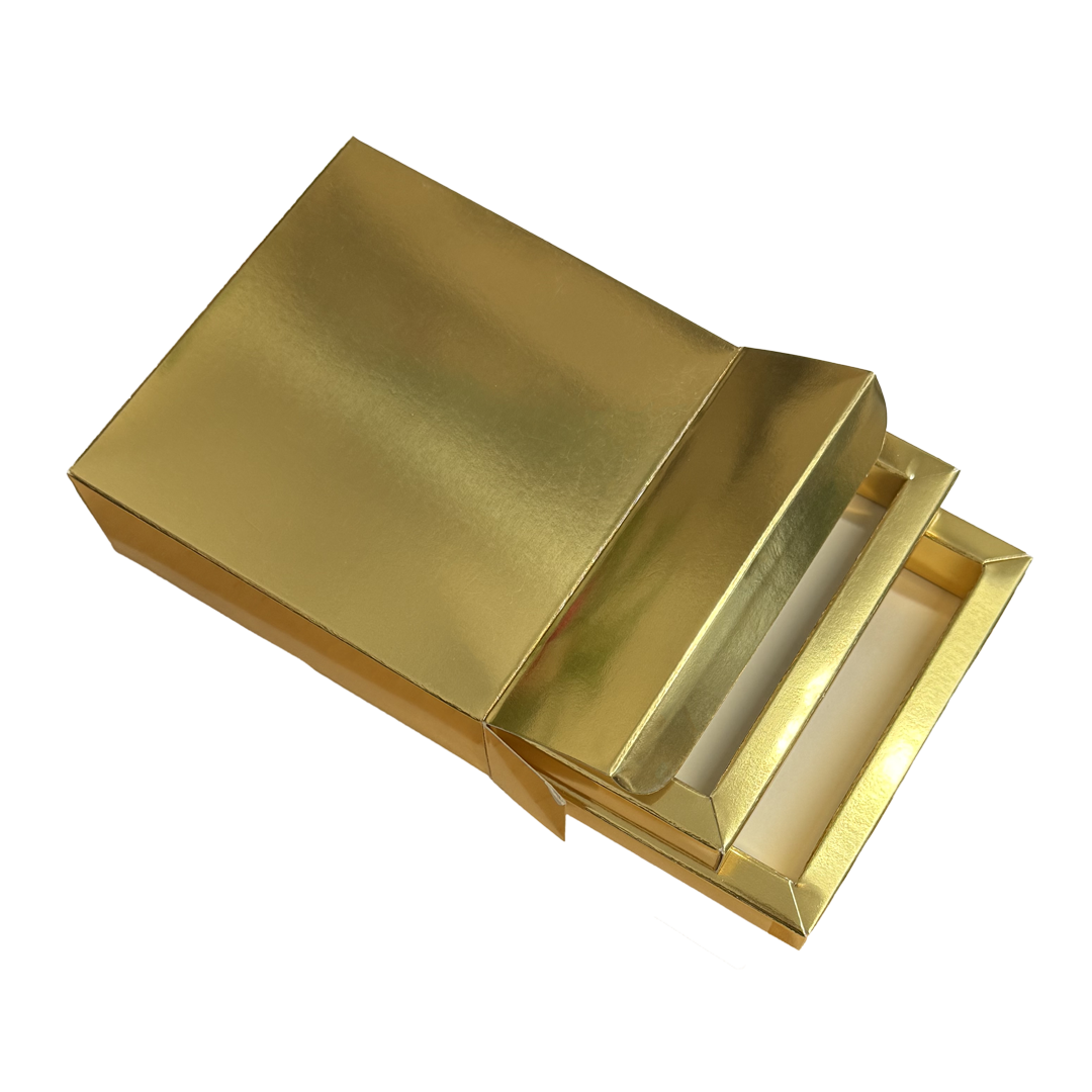 Boîtes pliantes en carton métallisé doré avec intérieur blanc, avec ou sans tiroirs.