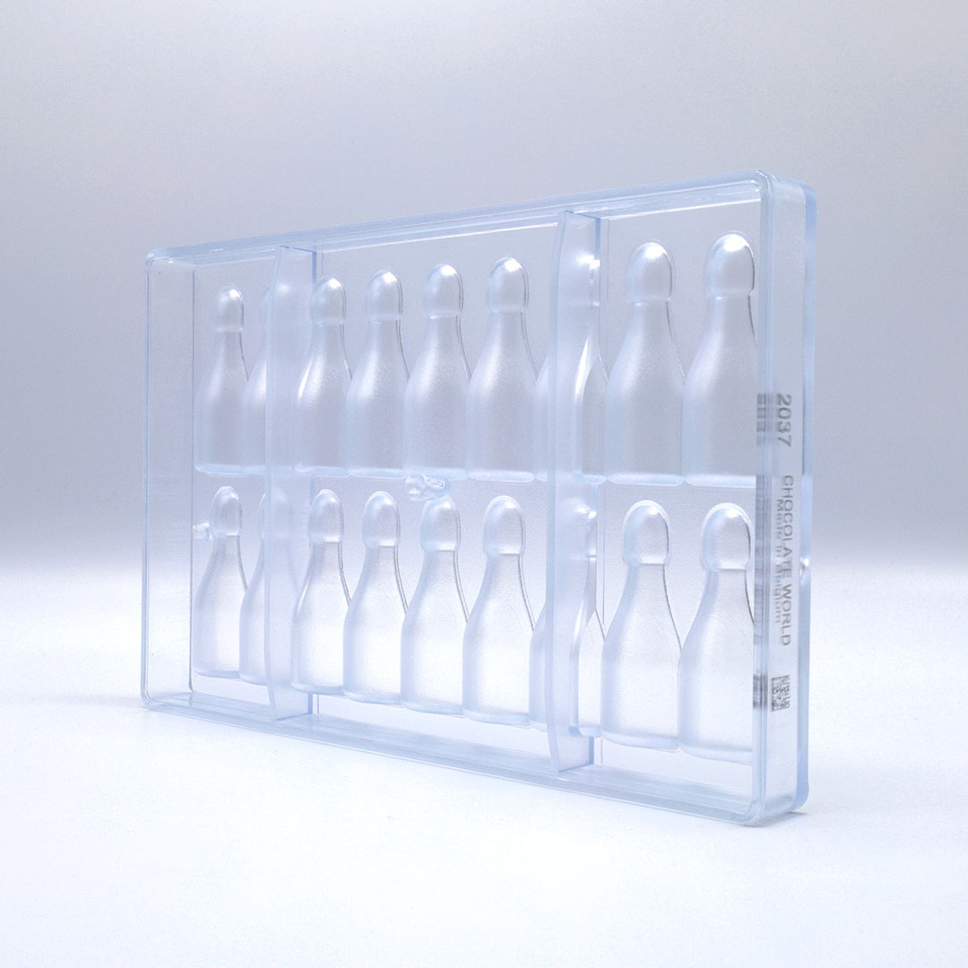 Moule Double à Chocolat – Bouteille de Champagne. 66 x 23 x 12mm, 18 cavités, 22g.