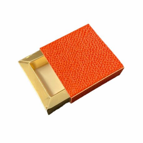 Étui pour 1 chocolat, enveloppe orange Capsicum, finis cuir, avec une base blanche, or ou argent.