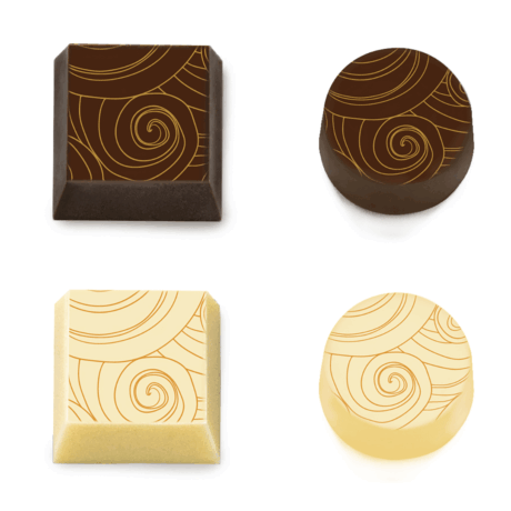 Feuilles de transfert (123 x 263mm). Compatibles avec les moules magnétiques Chocolate World (vendus séparément) de la série 1000, motif de boucles jaune.