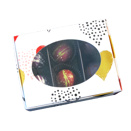 50 x Boîtes 1/4lb 1pièce avec fenêtre, collection Amore. Boite blanche, avec motif de coeur et confettis, noir, rouge, rose et or métallique.