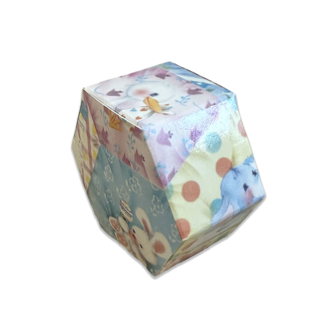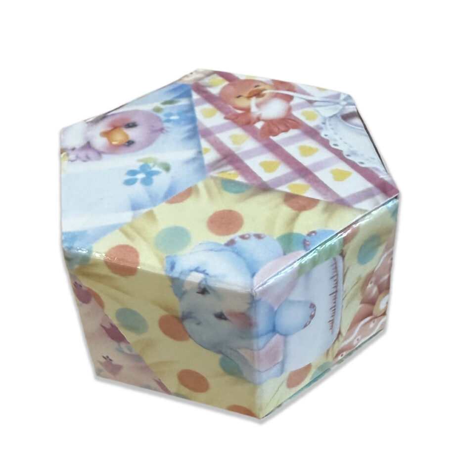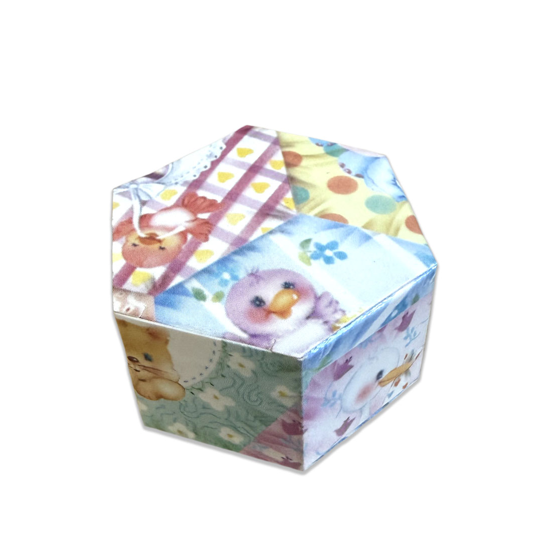 Petite boîte hexagonale pliante décorée d’illustrations d’animaux bébés. Lot de 10, importée d’Italie.