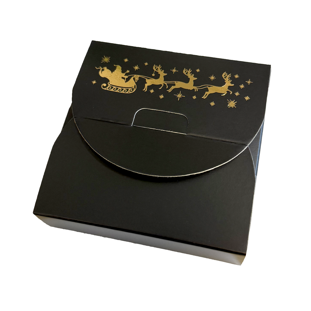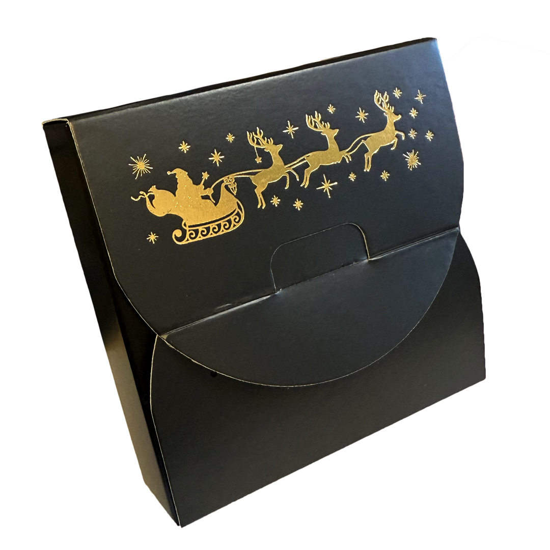 Boite noir avec motif – Traîneau du Père Noël or métallique, intérieur or, inclus cavités 4 mcx.
