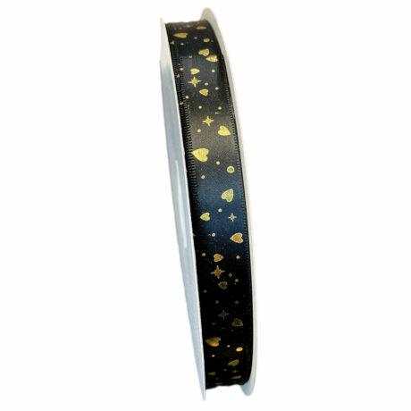 Ruban satin noir, avec coeur or. 15mm x 100m / 5/8 in x 109yds