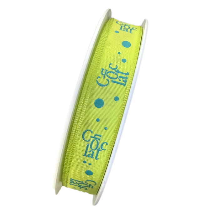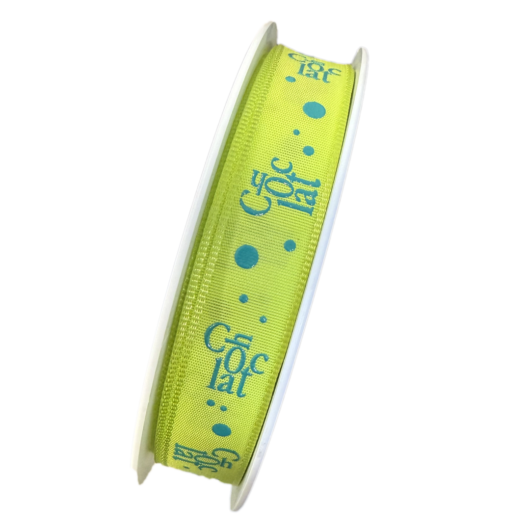 Ruban taffetas laitonné, vert limette et écriture en français bleu. 15mm x 25m (0.6in x 27yds).