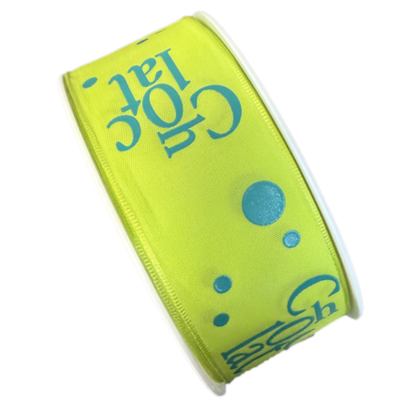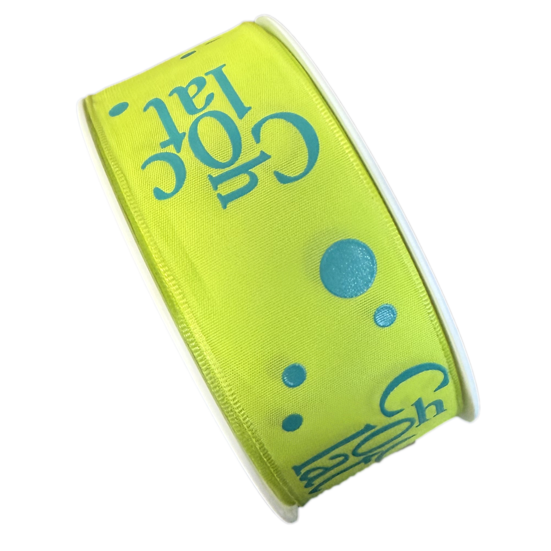 Ruban taffetas laitonné, vert limette et écriture en français bleu. 40mm x 25m (1.6in x 27yds).