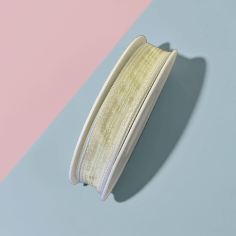 Ruban en taffetas, bords laitonnés, vert et crème, avec motif rayé, accent iridescents.