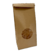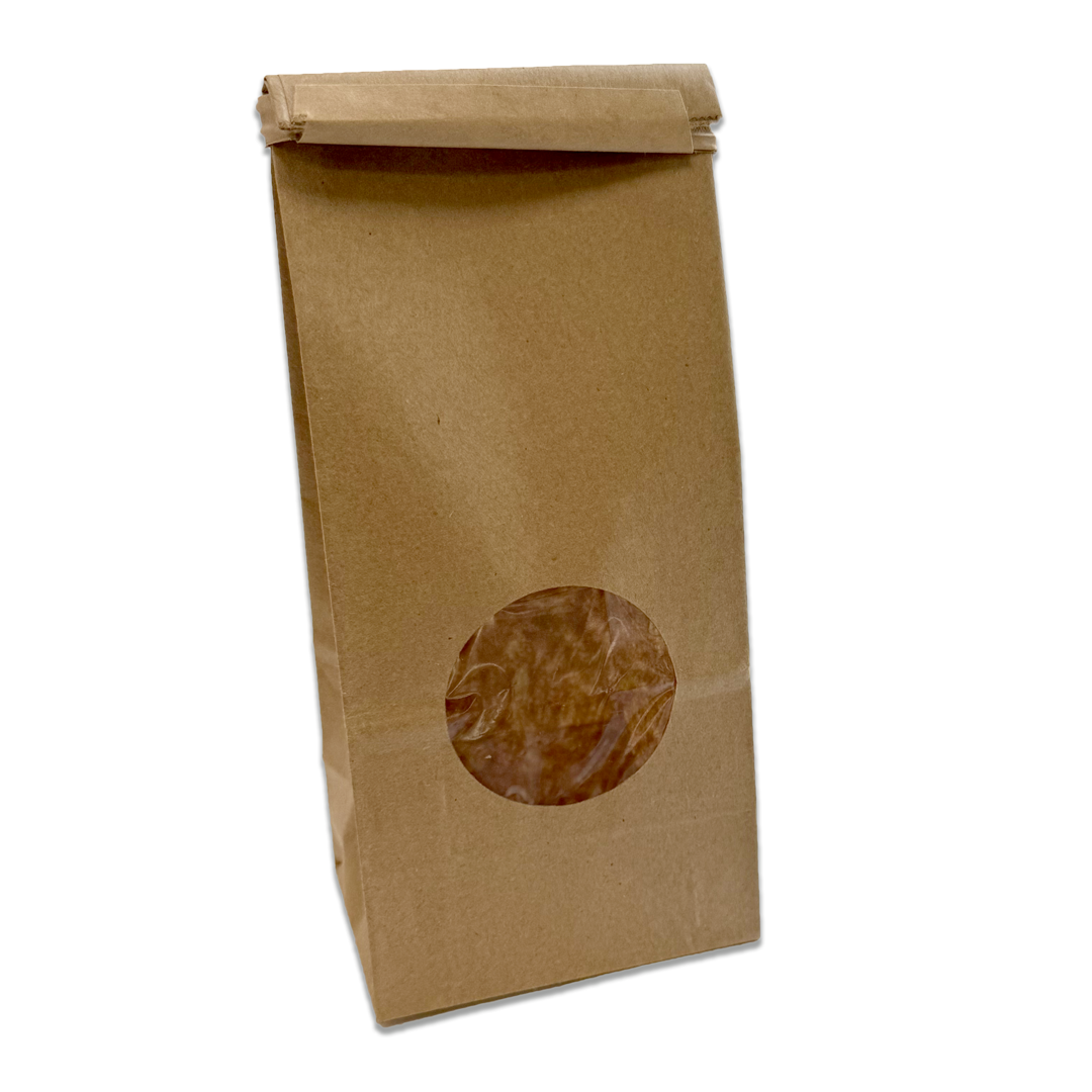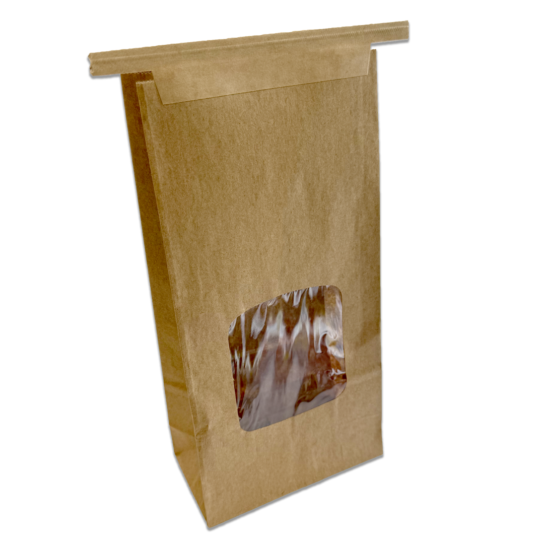 Sacs de boulangerie kraft avec une fenêtre ronde avant, doublure plastifiée en poly et Les languettes en métal pour une ouverture facile et une fermeture sécuritaire.