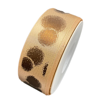 Caramel satin ribbon, metallic bronze circular pattern (1.6in)