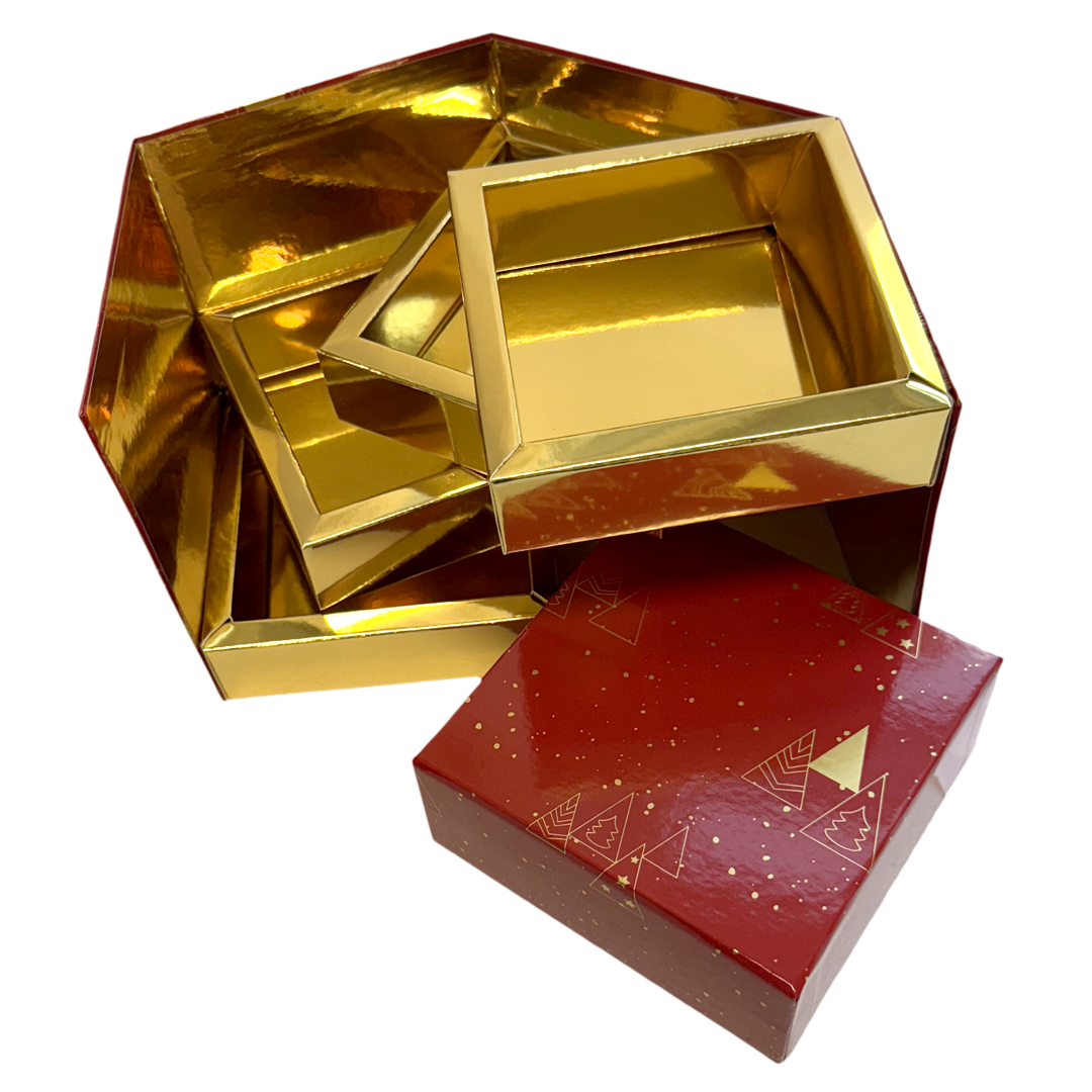 Rigid 4-tier display box, Balthazar, red and gold with a gold cavity.