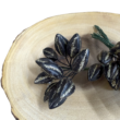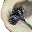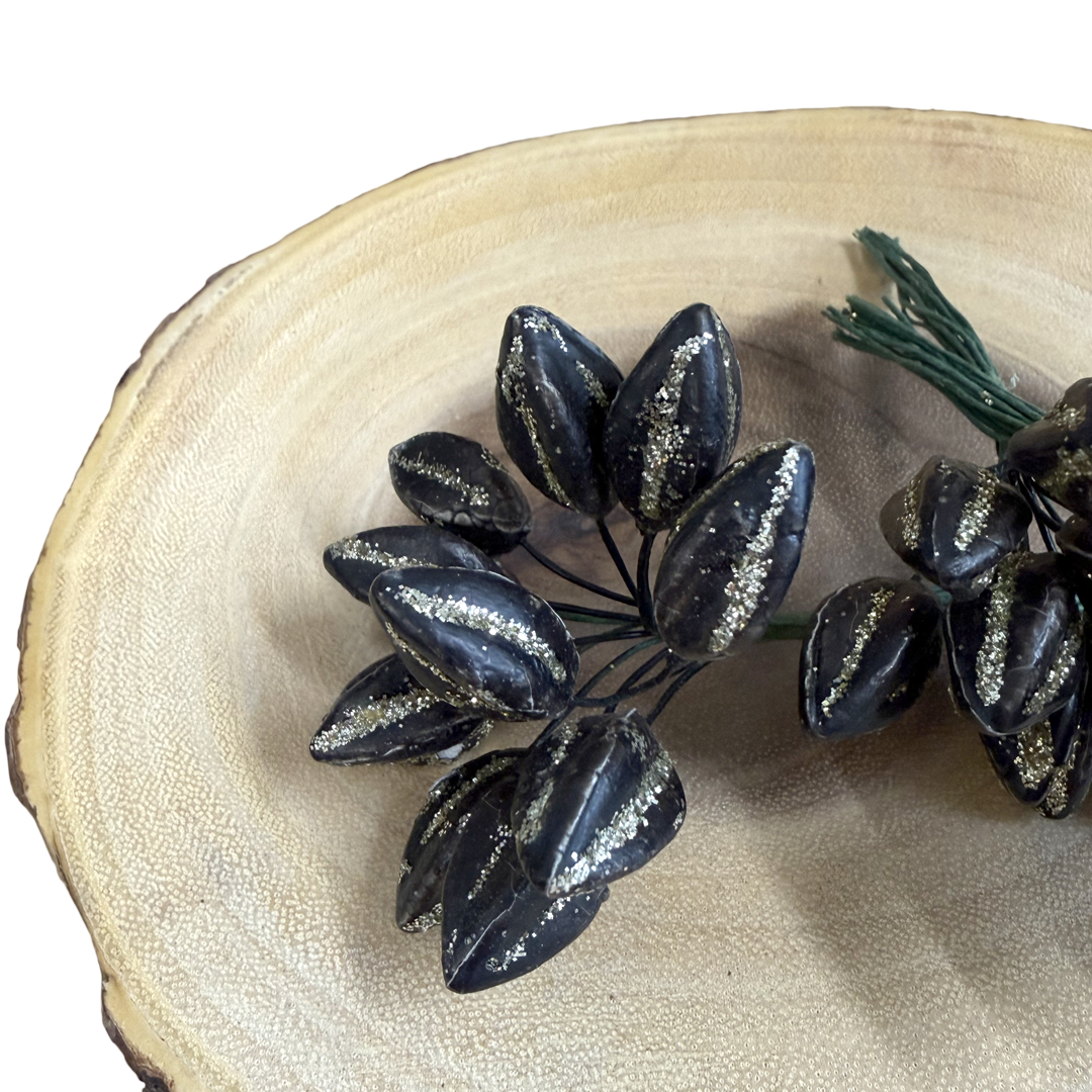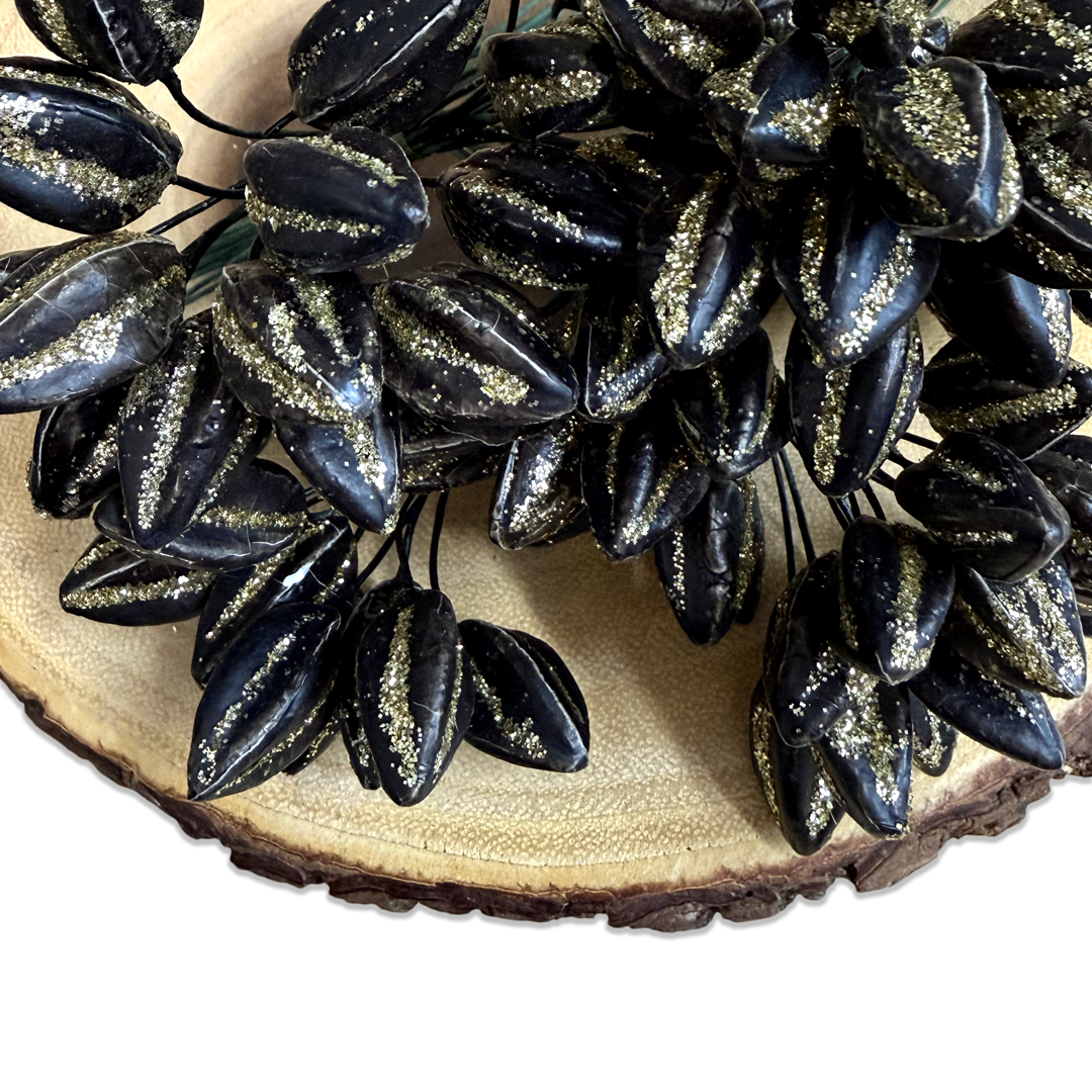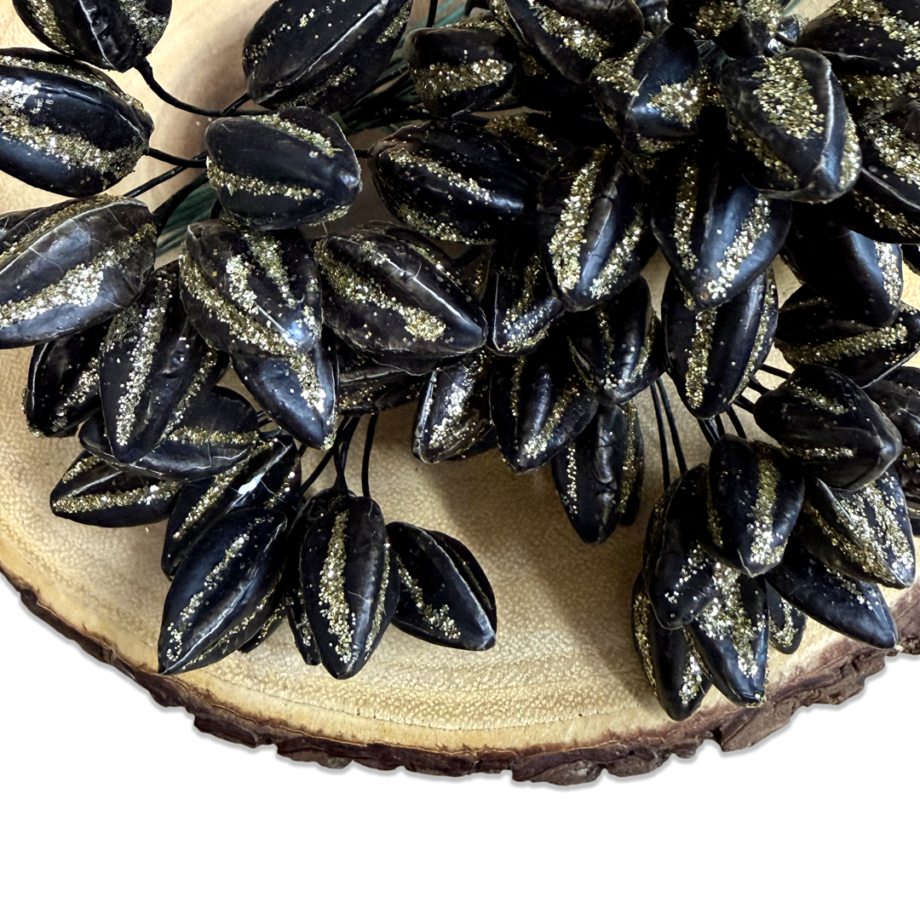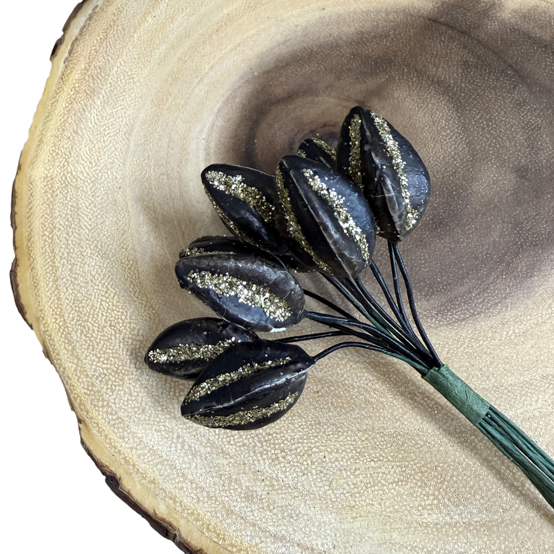 Chocolate black cocoa pod ornament with gold sparkles on a metal stem. Assortment 12 dozen, measurement of each pod between 20 and 30mm.