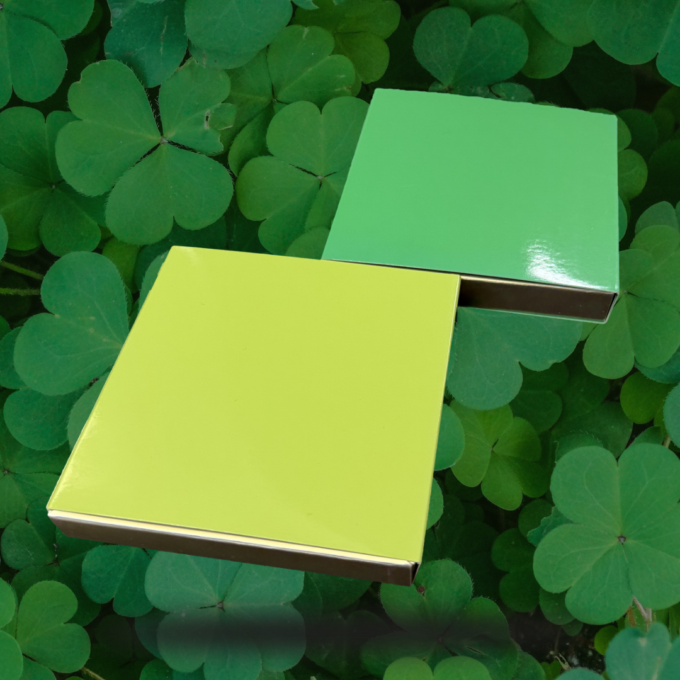 Box for 9 chocolates, clover fields, 2 colours of green-tinted envelopes with platinum base.