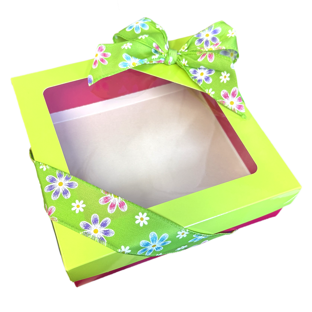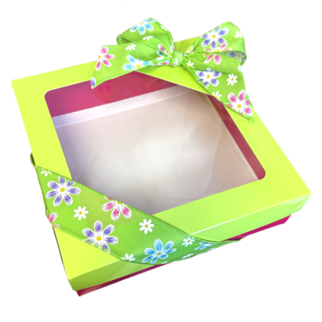 Square folding cookie box with a Spring Garden design, easy to assemble, with a window, in a glossy lime green finish. Deep matte fuchsia pink base for cookies.