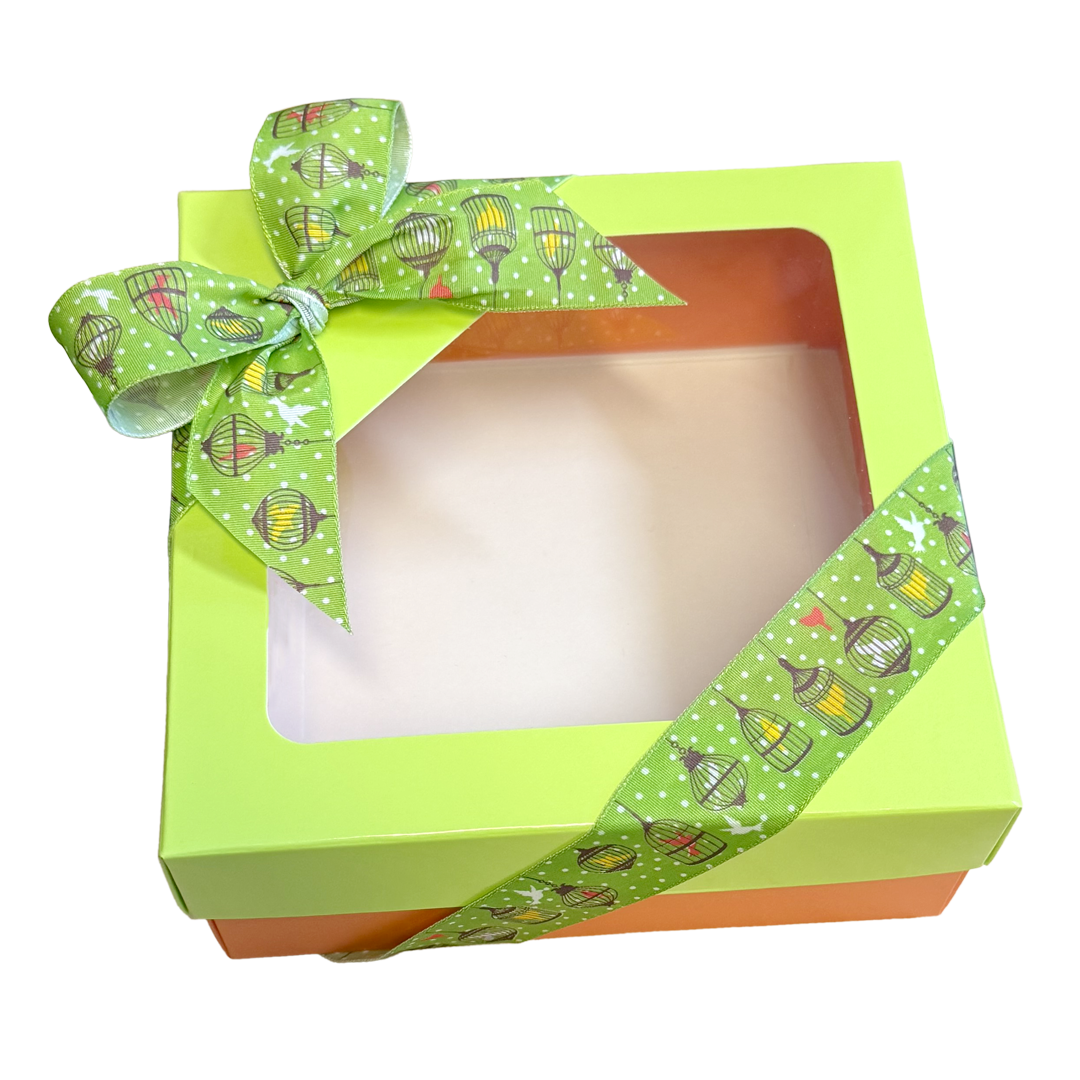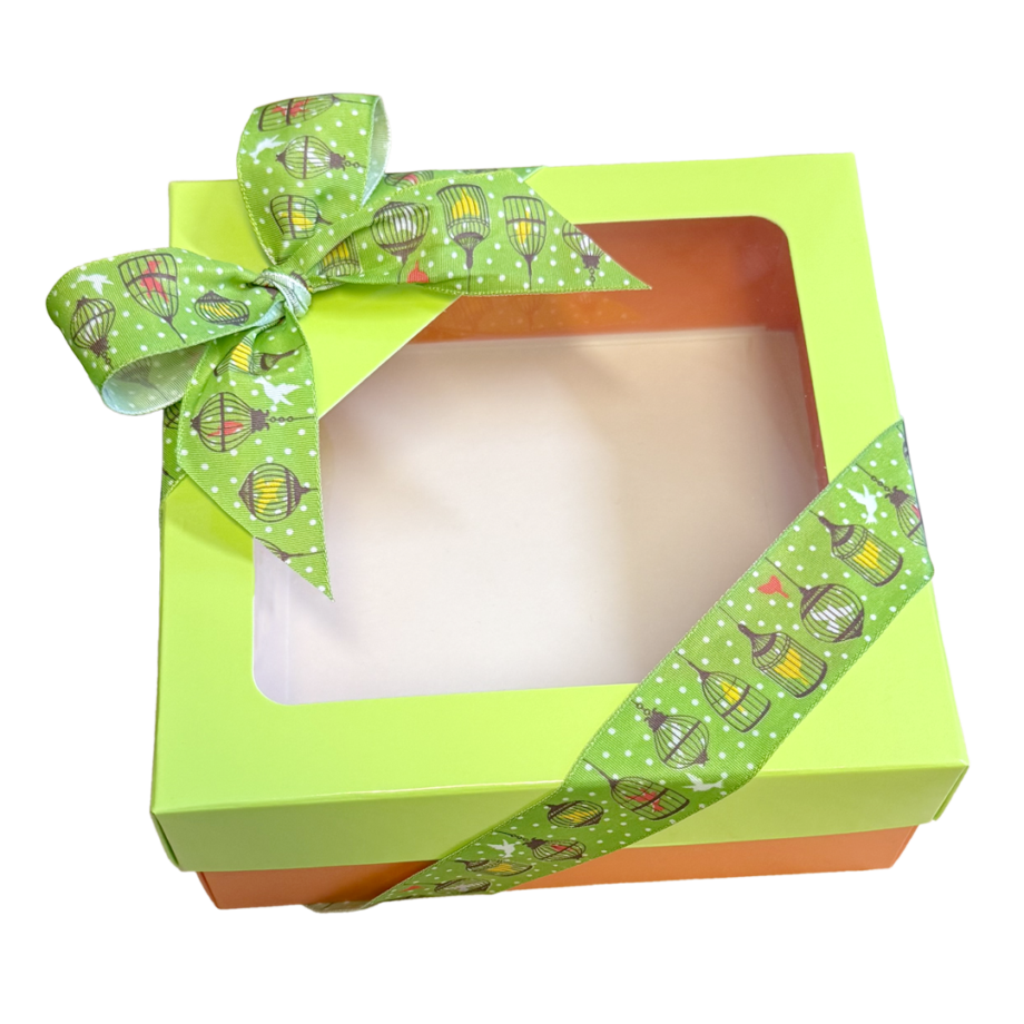 Square folding tea room box, easy to assemble, with a window, in a glossy lime green finish. Deep matte orange base for cookies.