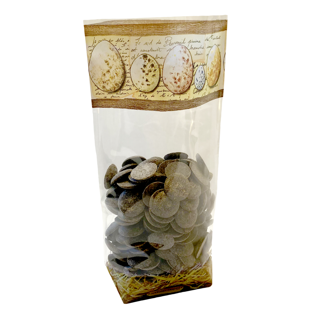 Happy Easter cellophane bag, cardboard bottom, egg patterns.