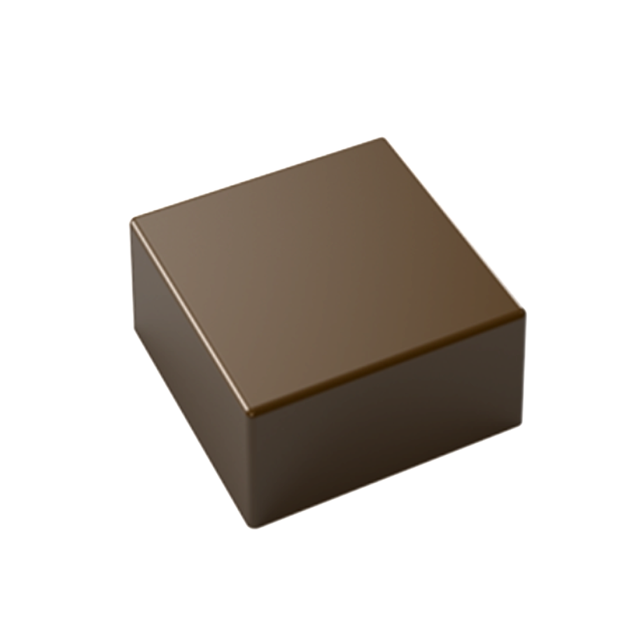 Professional polycarbonate mold for flat square chocolate and praline molds. 25 x 25 x 13 mm, approximately 9.2 g, 24 pieces.