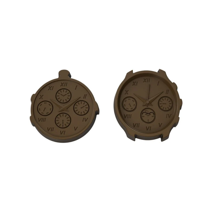 Professional polycarbonate chocolate mold with a watch design. 45.2 x 41.7 x 6 mm, approximately 7 g, 3 pieces.