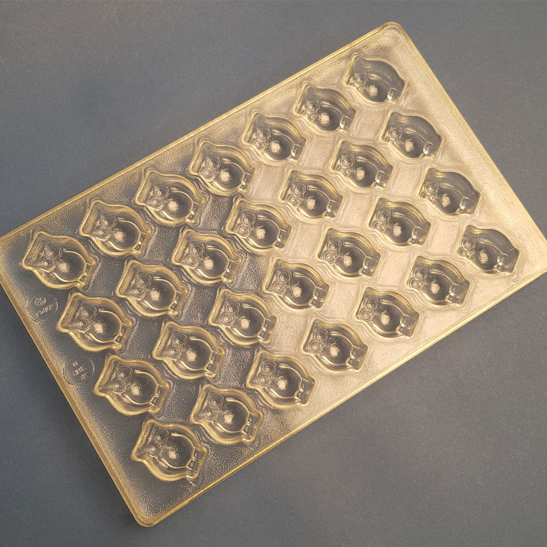 Injected polycarbonate molds, “Owl” praline. 34 x 26.4 x 16.6mm, approx. 10 g. 28 cavities (4×7), mold dimensions 275 x 175 x 24mm.