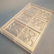 Injected polycarbonate molds, tablet with bears in relief. 160 x 80 x 9mm, approx. 100 g. 3 subjects per mold, mold dimensions: 275 x 175 x 24mm.