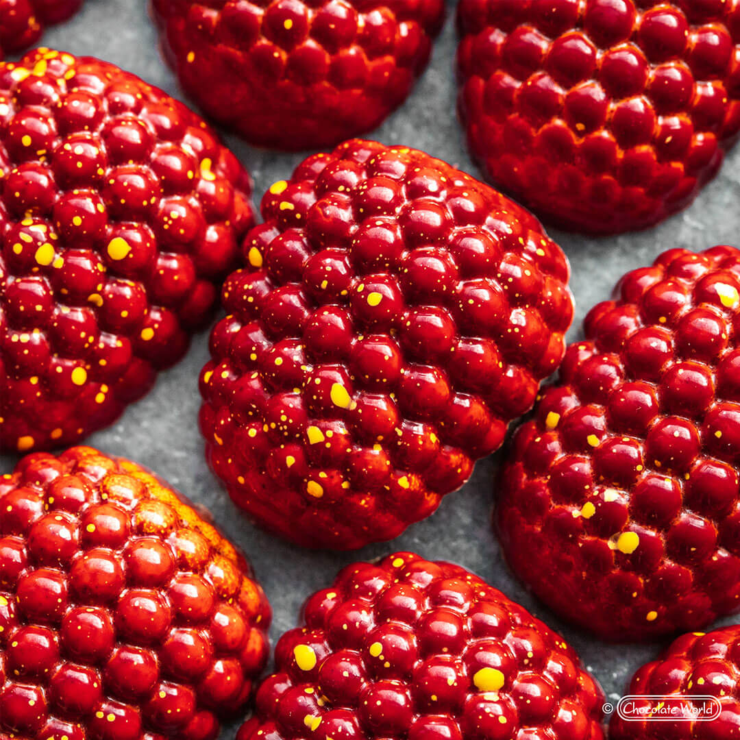Professional polycarbonate double mold, praline, designed and developed in cooperation with Patrick De Vries. 24 cavities, approx. 29.5mm x 25mm x 12.5mm, approx 5.5g.