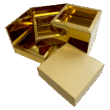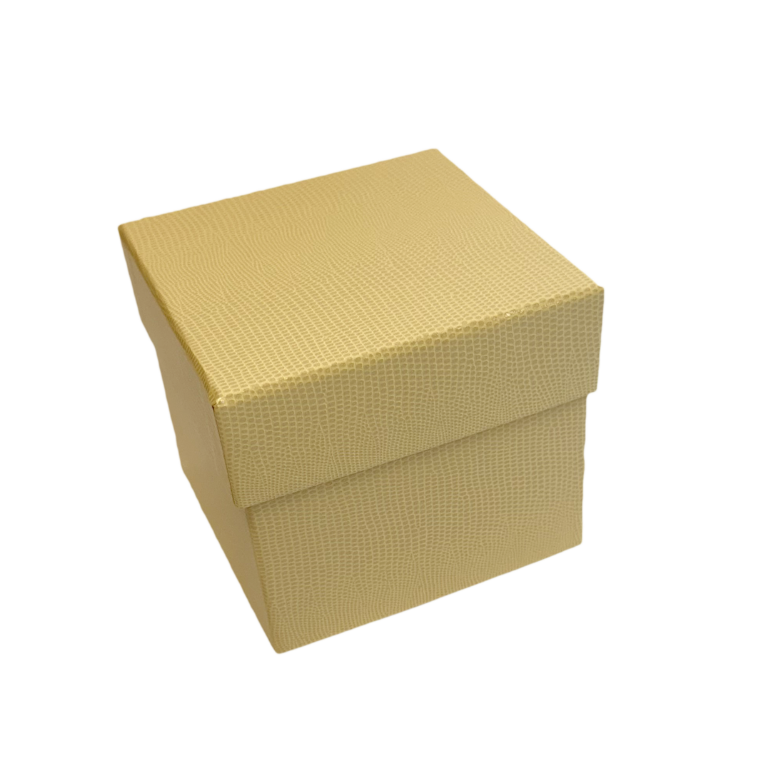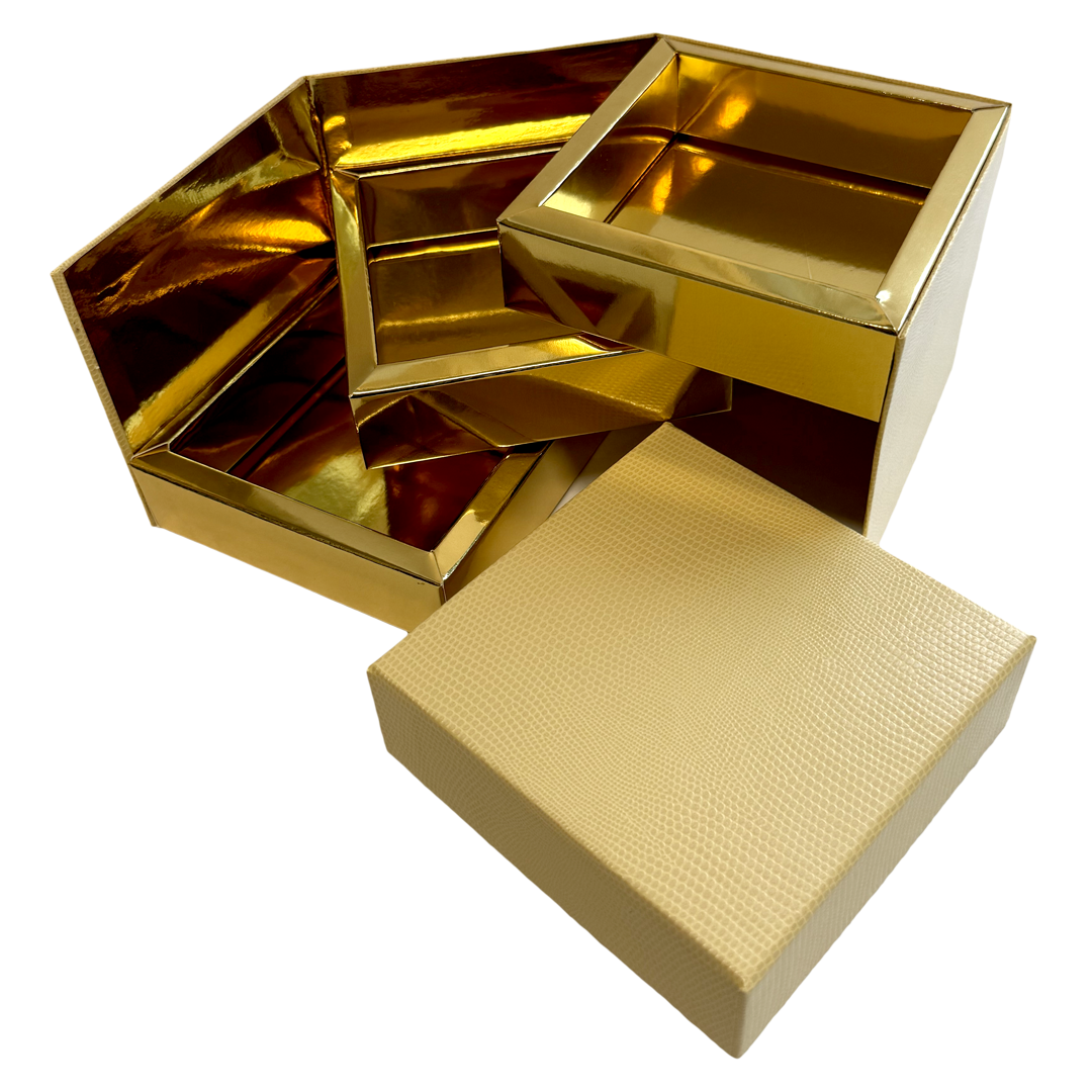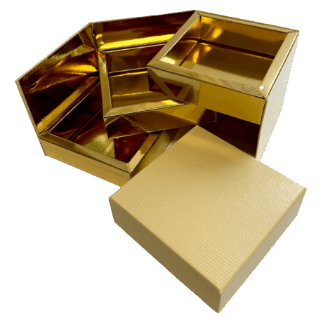 Rigid 3-tier display box, leather finish – Champagne, with a gold cavity. Holds 9 chocolates per tier. Includes glassine paper.