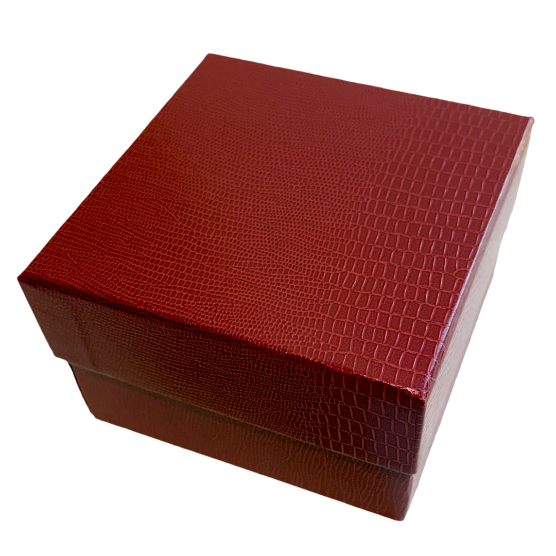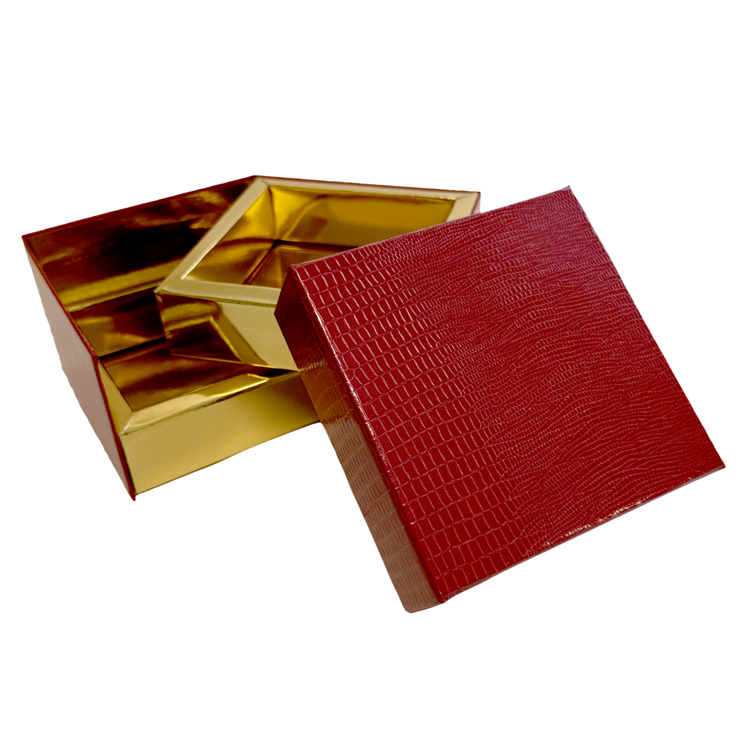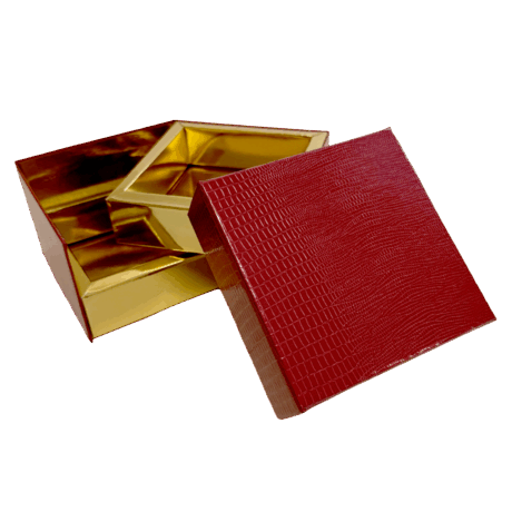 Rigid 2-tier display box, Leather Finish – Raspberry, with a gold-plated cavity.