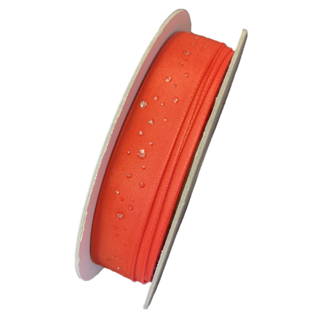 Taffeta ribbon with brass-plated edges, orange-red with silver sequin accents.