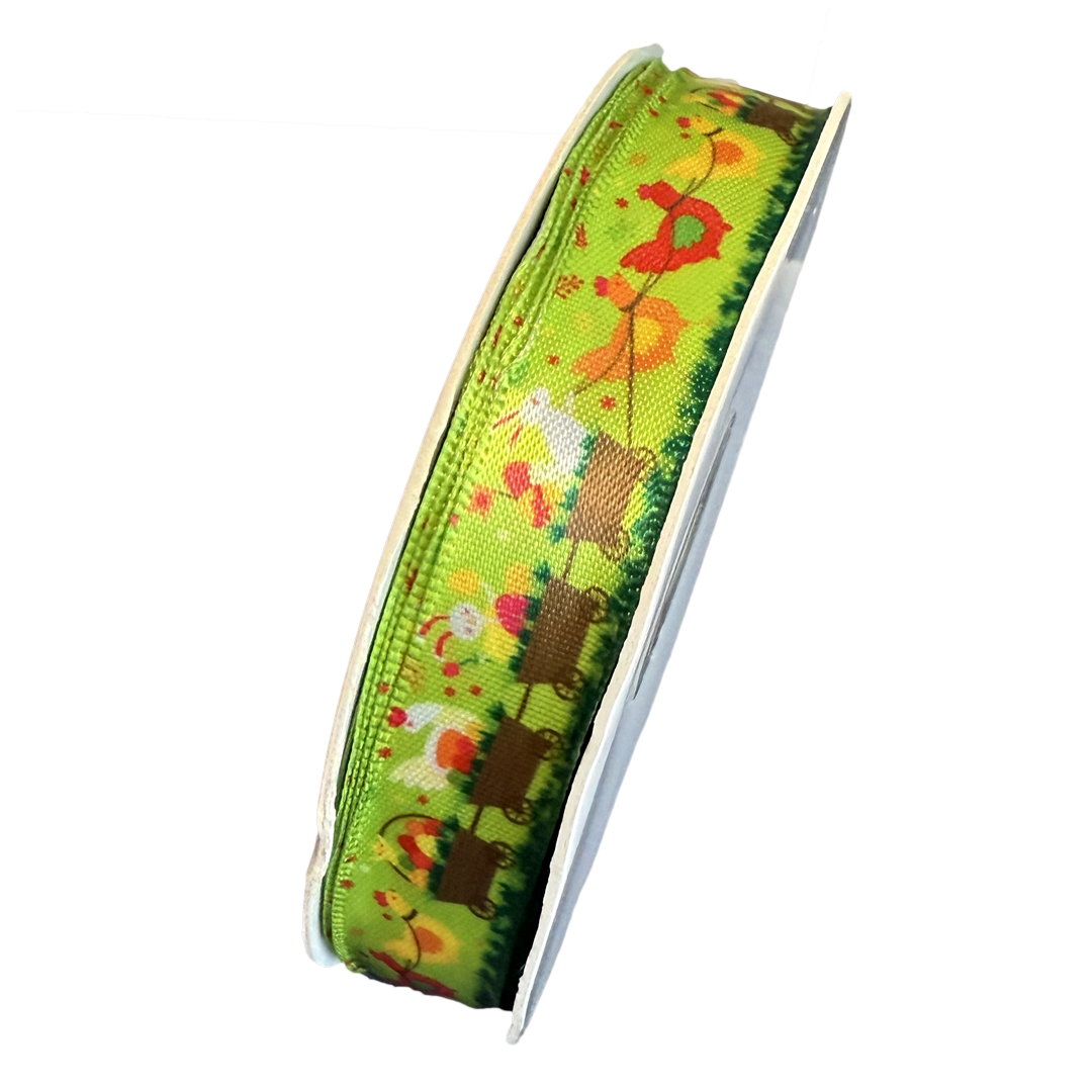 Satin ribbon with wired edges, green with multicolored chicken pattern – Easter Parade, 25 m x 15 mm.