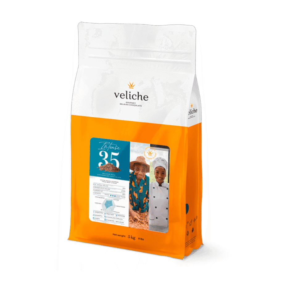 Belgian milk couverture chocolate, made from West African cocoa beans, with a pronounced milk profile, delicate caramel notes, and a serene cocoa finish. Intense 35 is part of a carefully selected range of couverture chocolates suitable for a variety of applications and preparations.