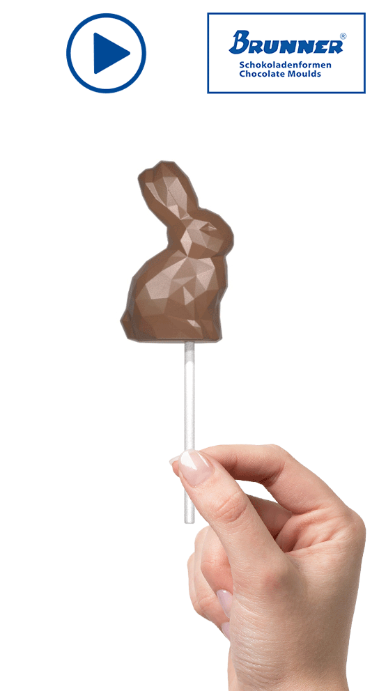 Polycarbonate lollipop mold – Polly Rabbit. 69 x 44 x 13 mm, approx. 20 g, 4 cavities (1×4), mold dimensions: 275 x 175 x 24 mm.