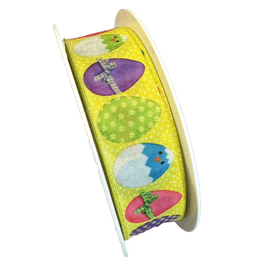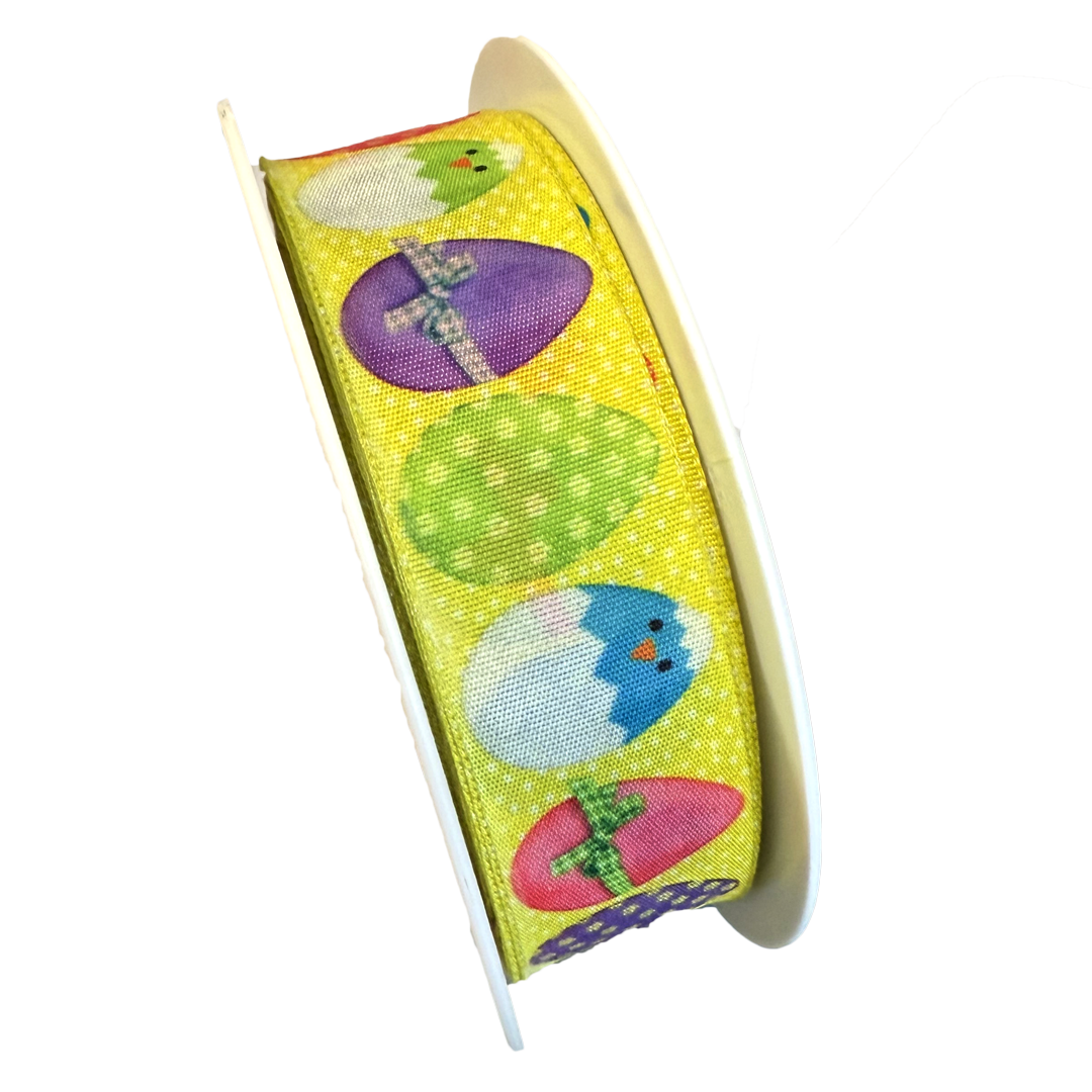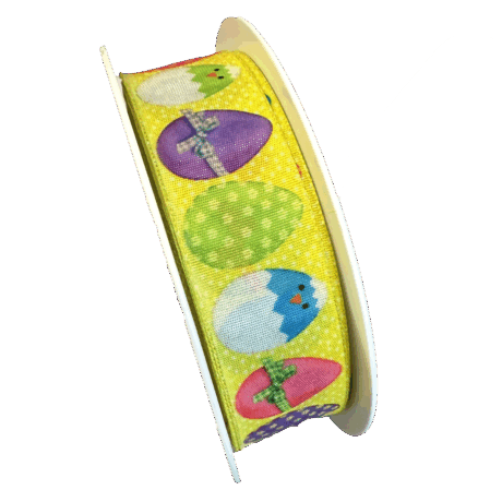 Multicolored taffeta ribbon with wired edges, with an Easter-themed pattern – Coco Surprise. 27 yds x 1 in