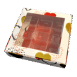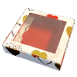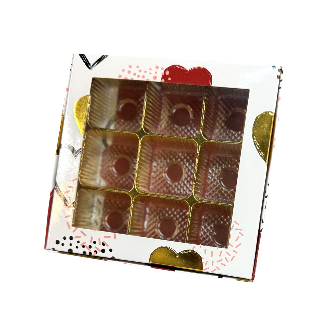 White box, with hearts and confetti pattern, black, red, pink and metallic gold.