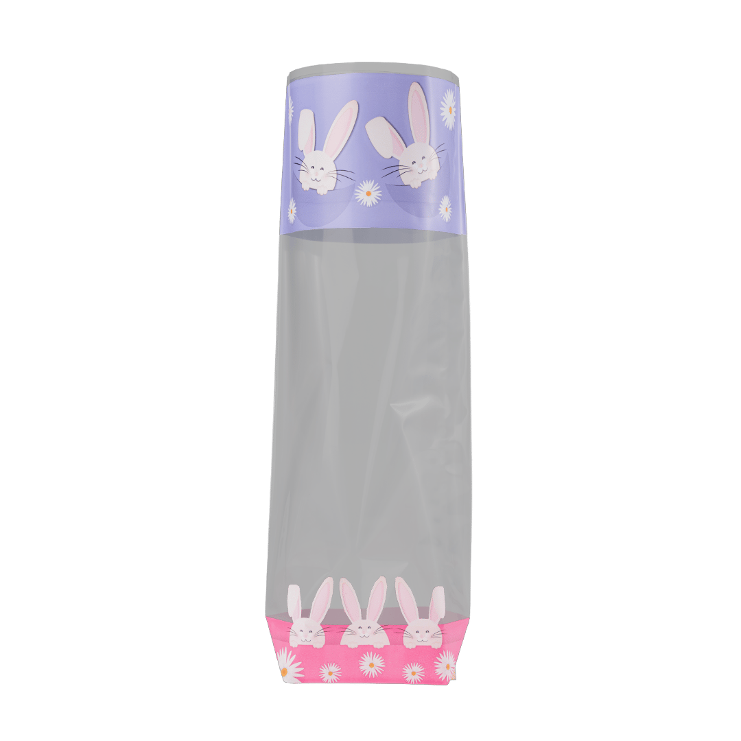 35µ Polypropylene Bag – Happy Bunnies (2S), PP500 cardboard base, Easter-themed design with bunnies and flowers. 100 units, 100 x 220 mm