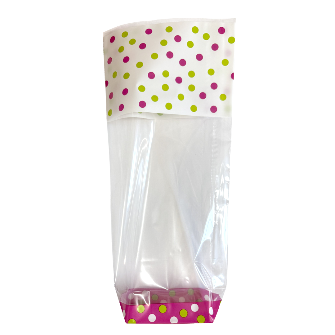 Clear cellophane gusseted bag with pink and green polka dots.
