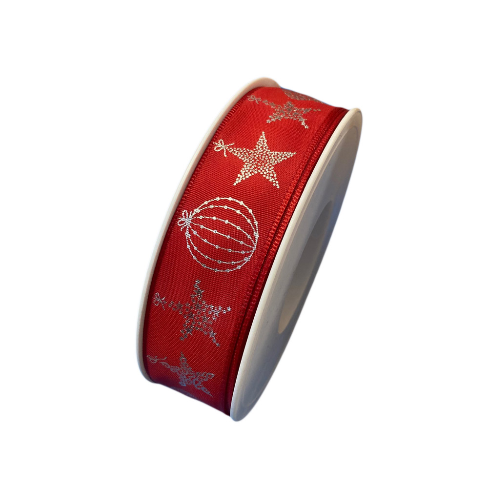 Red taffeta ribbon, wired, silver metallic Christmas ornament pattern