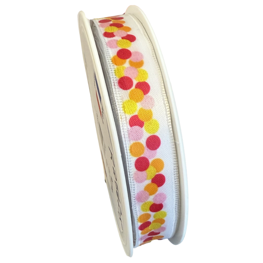 Wired satin ribbon, White with Colored Polka Dots – Pop Explosion. 15mm x 25m (0.6in x 27yds)